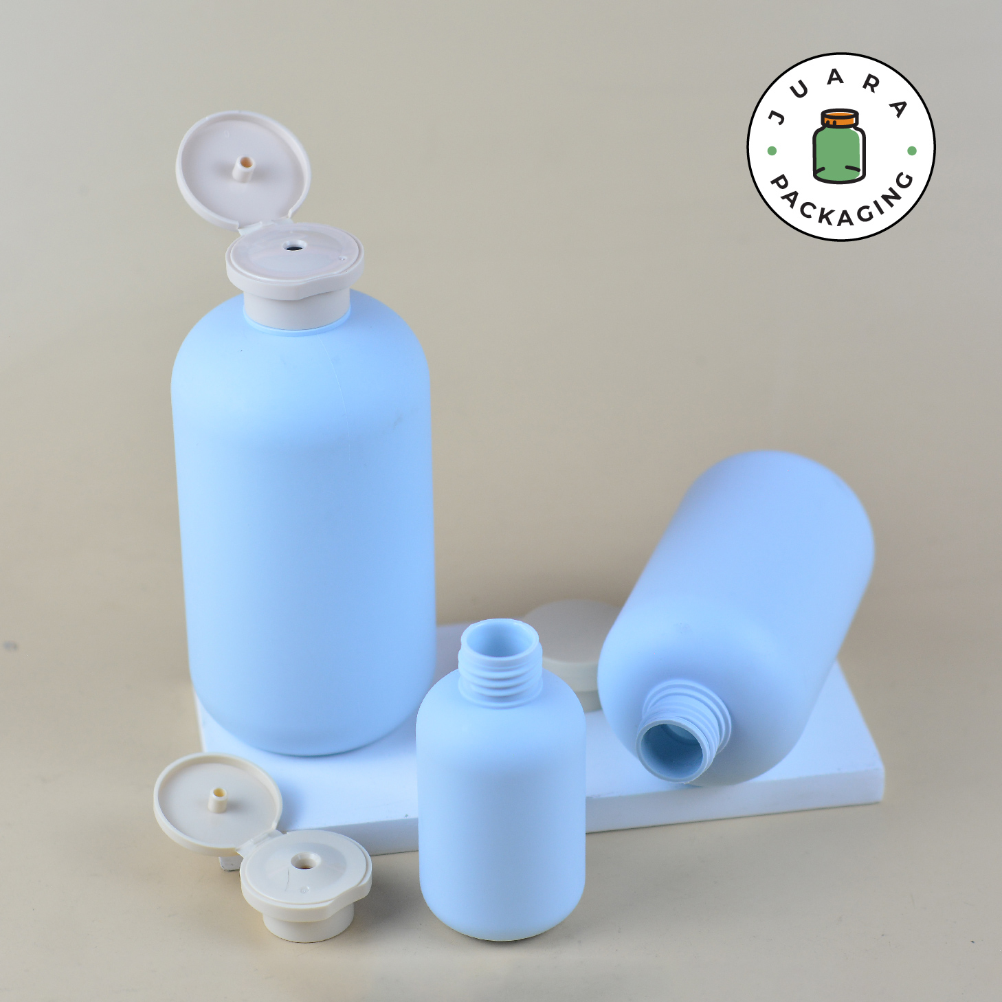 Botol Fliptop Plastik tersedia dalam ukuran 100ml, 300ml dan 500ml dengan warna biru pastel dan tutup fliptop coklat. Botol plastik ini ideal untuk menyimpan cairan seperti sabun atau lotion. Kemasan produk yang ringan dan praktis ini cocok untuk penggunaan sehari-hari, serta mudah dibawa saat bepergian.