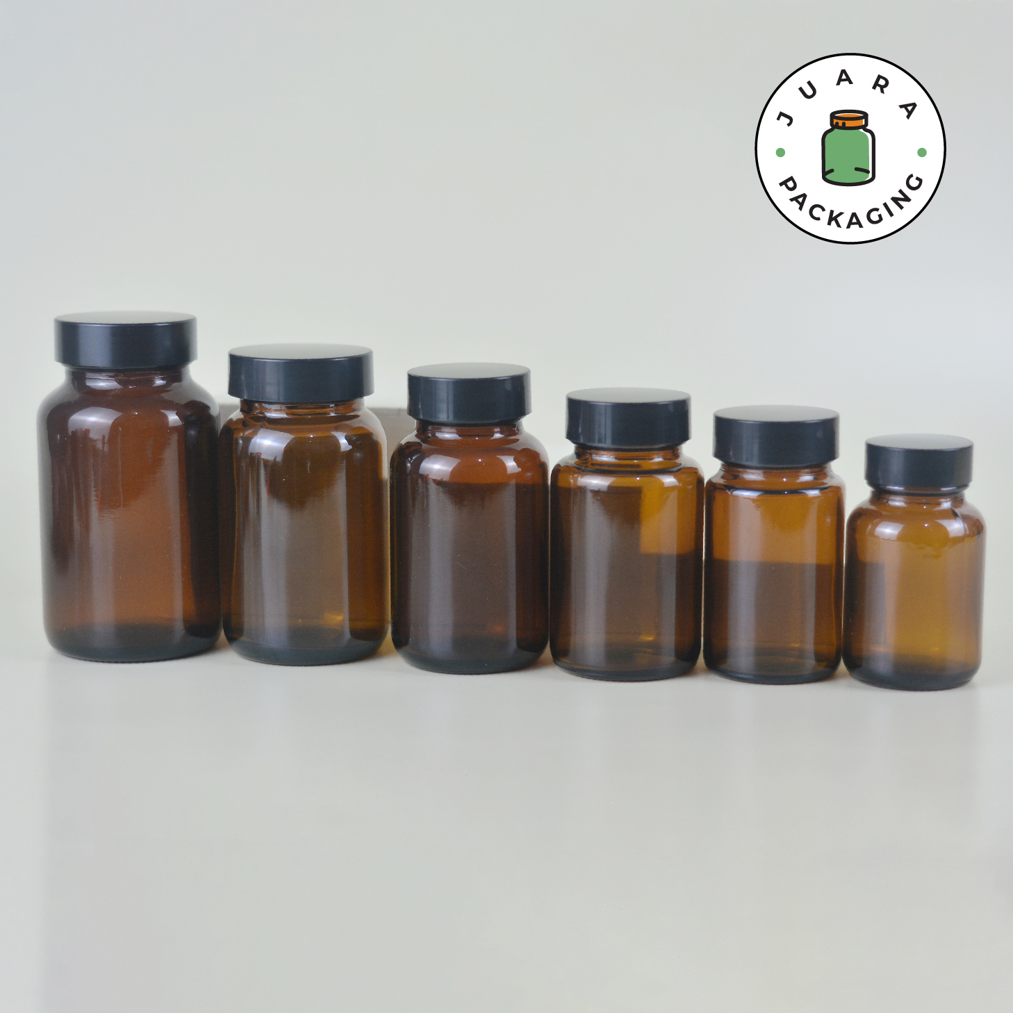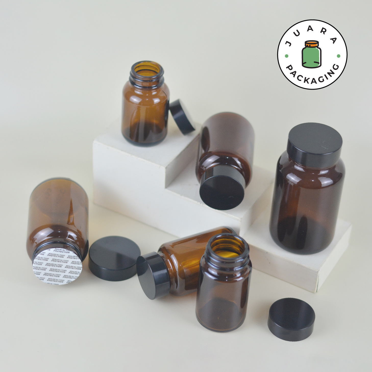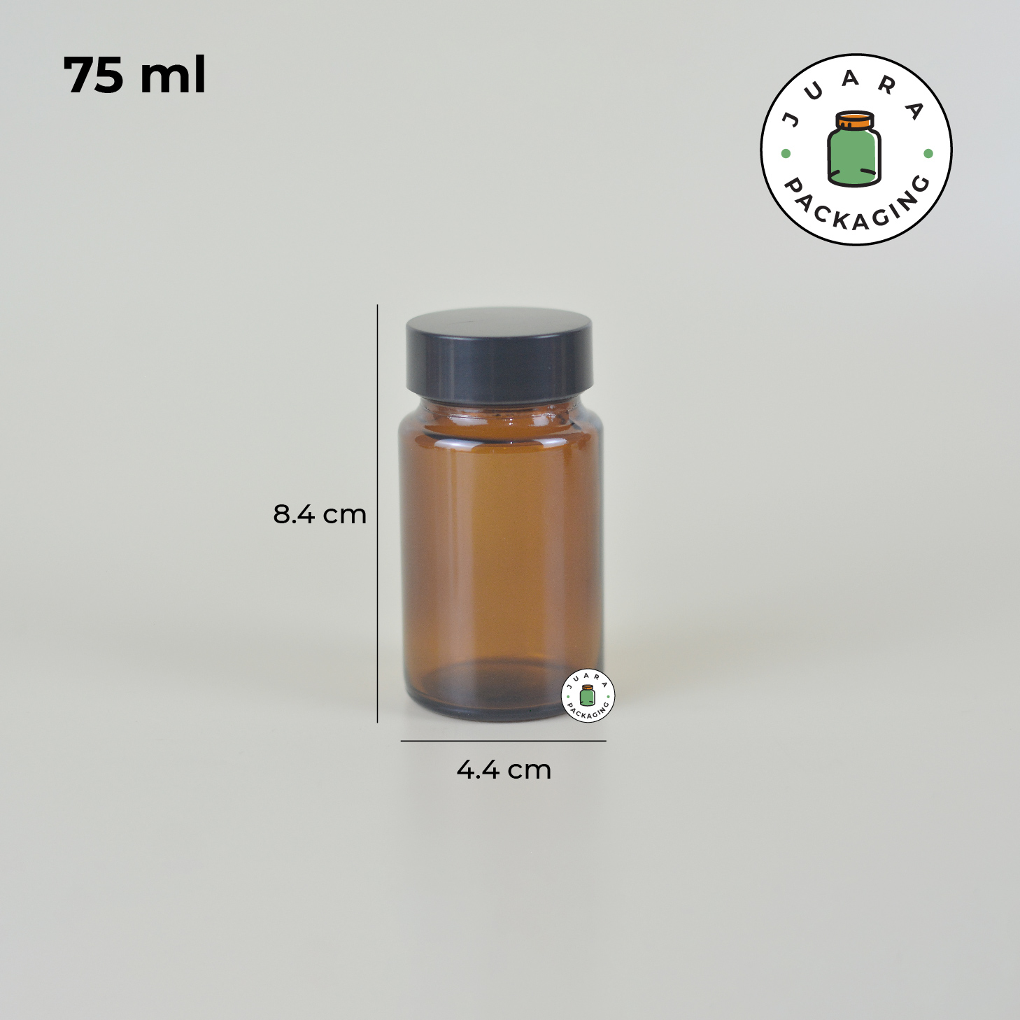 Botol Kaca Amber 60 ml 75 ml 100 ml 120 ml 150 ml 200 ml – Jar Kaca Coklat Tebal dengan Tutup Hitam + Inner Seal untuk Kapsul Vitamin Obat Suplemen Herbal Kemasan Aman Anti Bocor