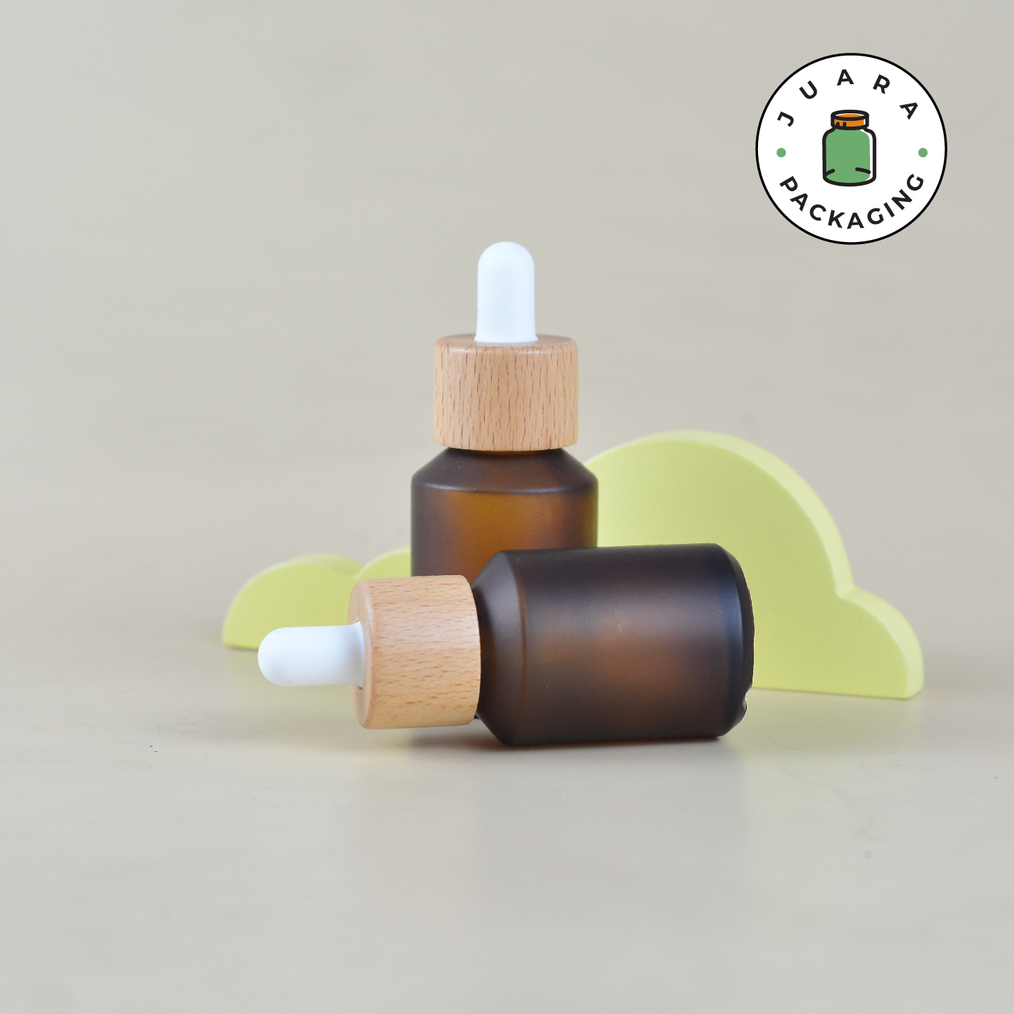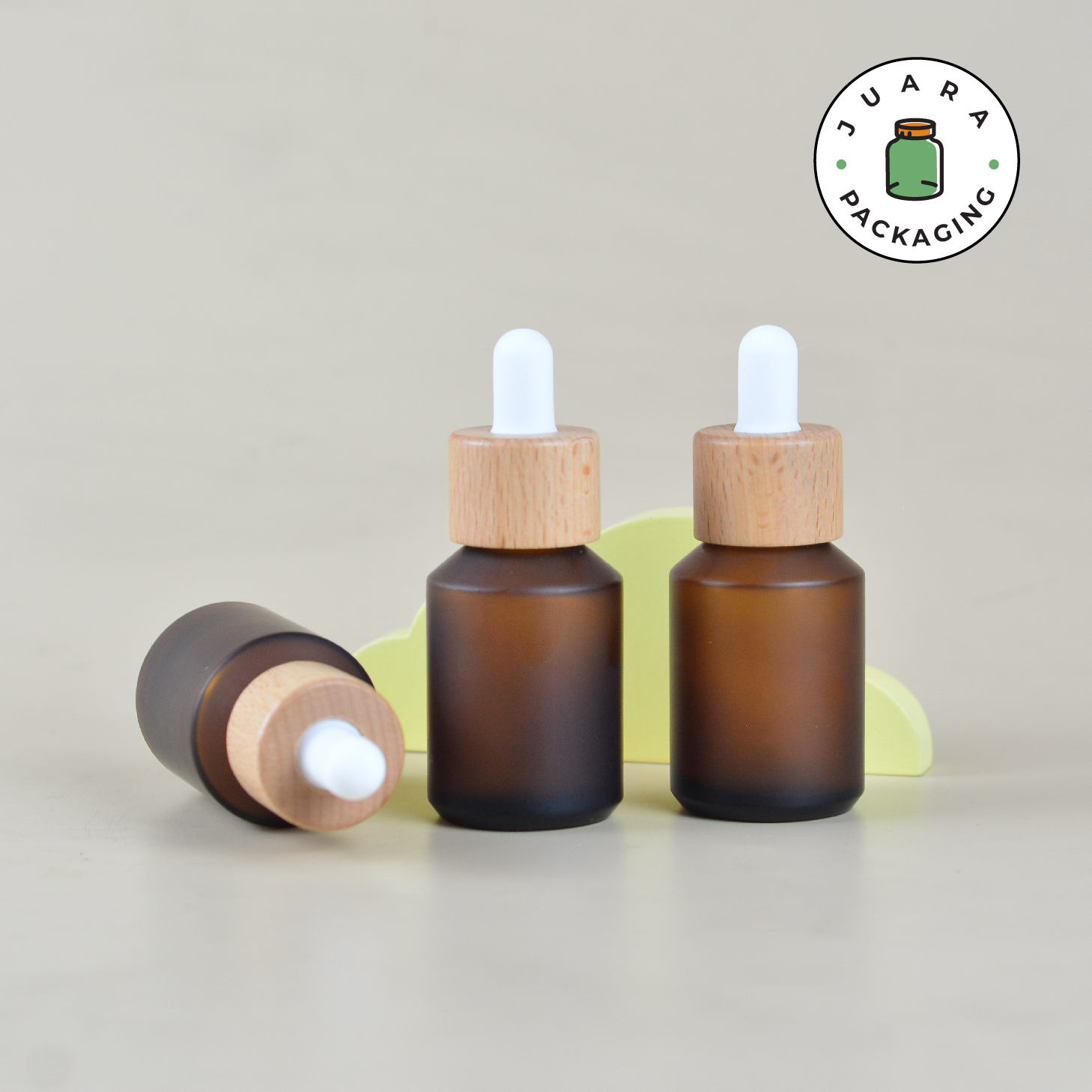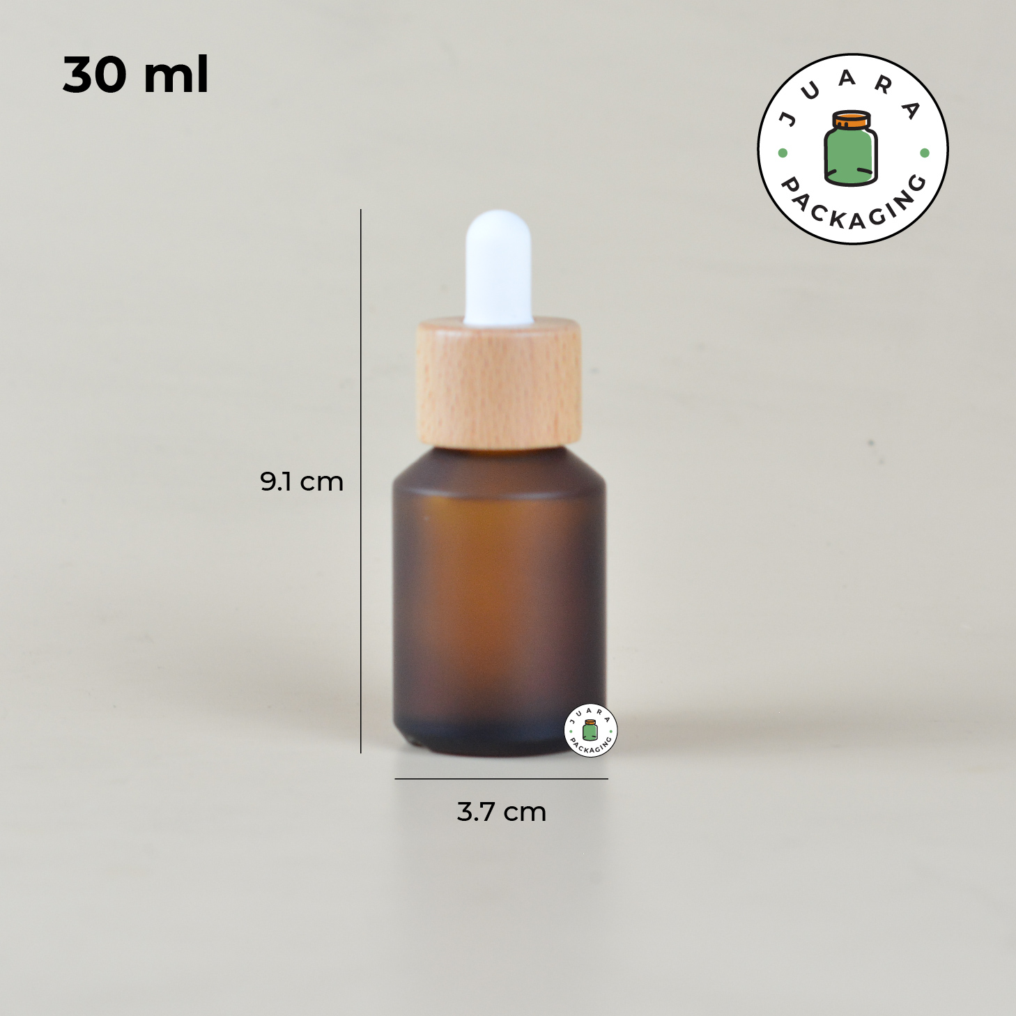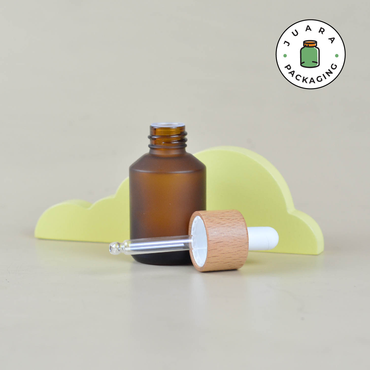 Botol Kaca Amber 30ml – Botol Serum Skincare Warna Coklat Buram dengan Tutup Pipet Karet Putih & Ring Kayu Leher Miring | Botol Pipet Kaca Tebal Isi Ulang 30 ml