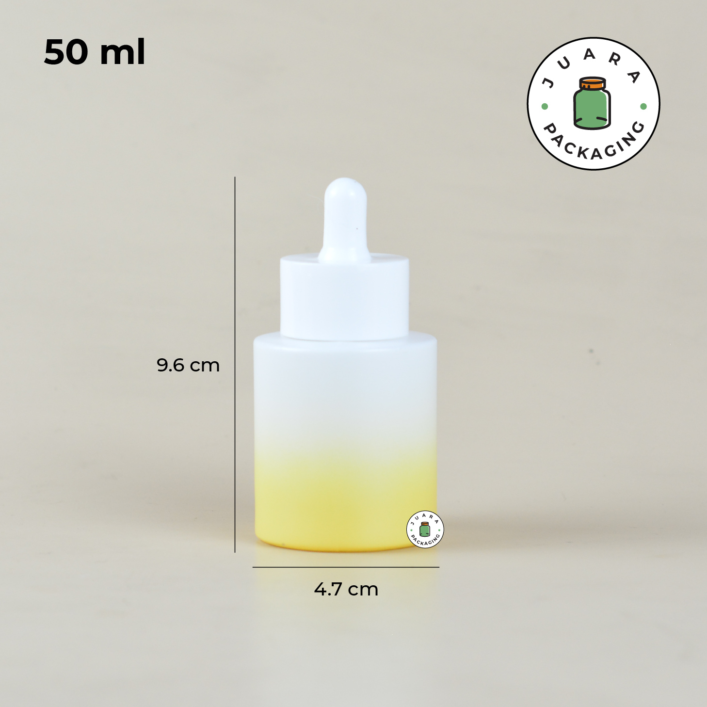 Botol Kaca 50ml ini hadir dengan desain gradasi putih ke kuning yang elegan. Dilengkapi tutup pipet karet dengan ring putih, kemasan produk ini dirancang khusus untuk serum skincare. Praktis, higienis, dan menarik, botol ini menjaga kualitas produk sekaligus memberikan tampilan yang mewah dan profesional.