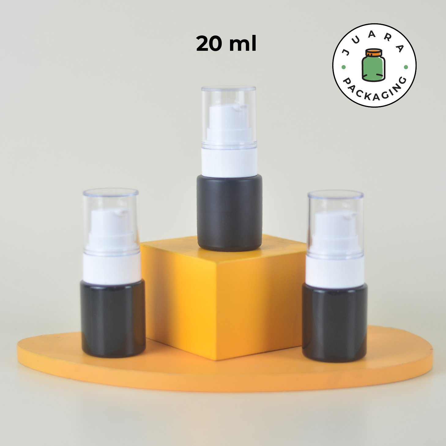 Botol Kaca 20ml Warna Hitam Glossy & Doff Tutup Pump Bebek Putih – Wadah Skincare Serum Lotion Toner Essence Foundation Kosmetik Refill Travel Size Tebal Elegan Anti Bocor