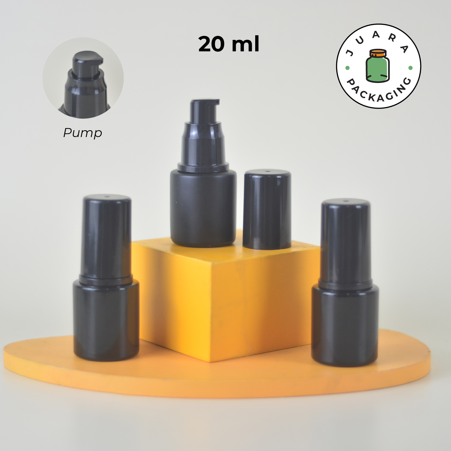 Botol Kaca 20ml Warna Hitam Glossy & Doff Tutup Pump Hitam Tutup Silinder Hitam – Wadah Skincare Serum Lotion Toner Essence Foundation Kosmetik Refill Travel Size Tebal Elegan Anti Bocor