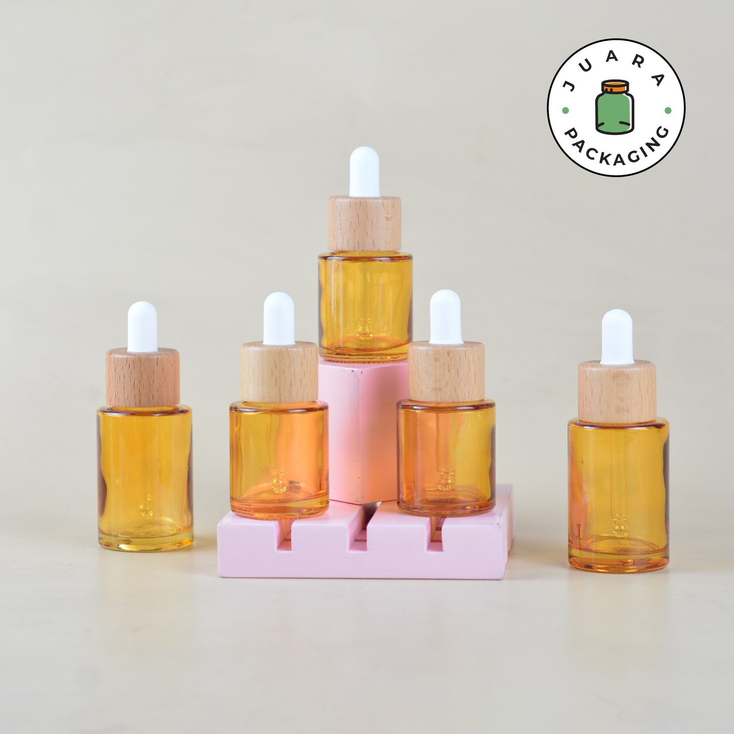 Botol Kaca 20ml dan 30ml ini hadir dengan desain kaca kuning bening glossy yang elegan. Dilengkapi tutup pipet karet putih dengan ring kayu, kemasan produk ini memberikan kesan alami dan eksklusif. Cocok untuk serum atau skincare, menjaga kualitas produk dengan tampilan yang menarik dan fungsional.