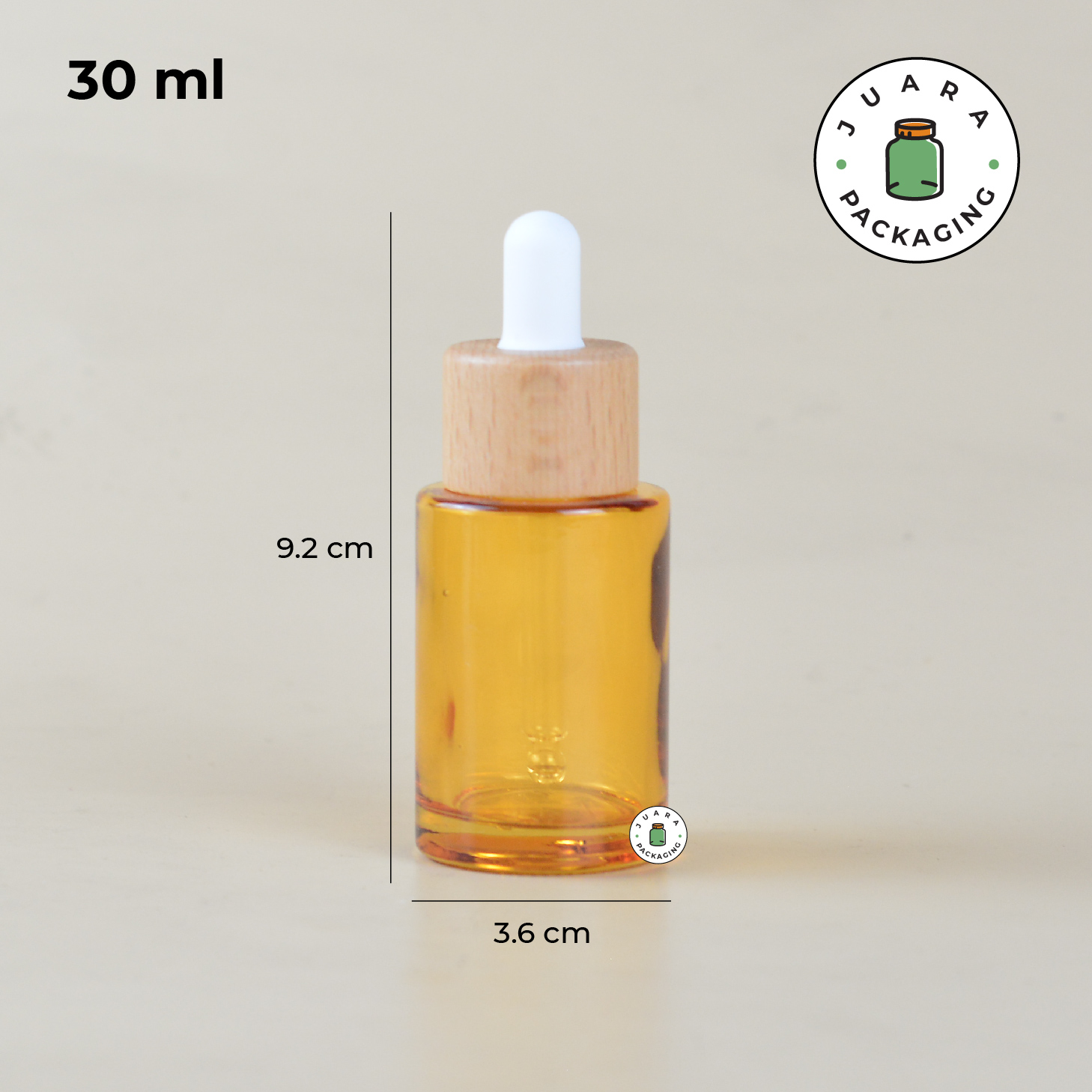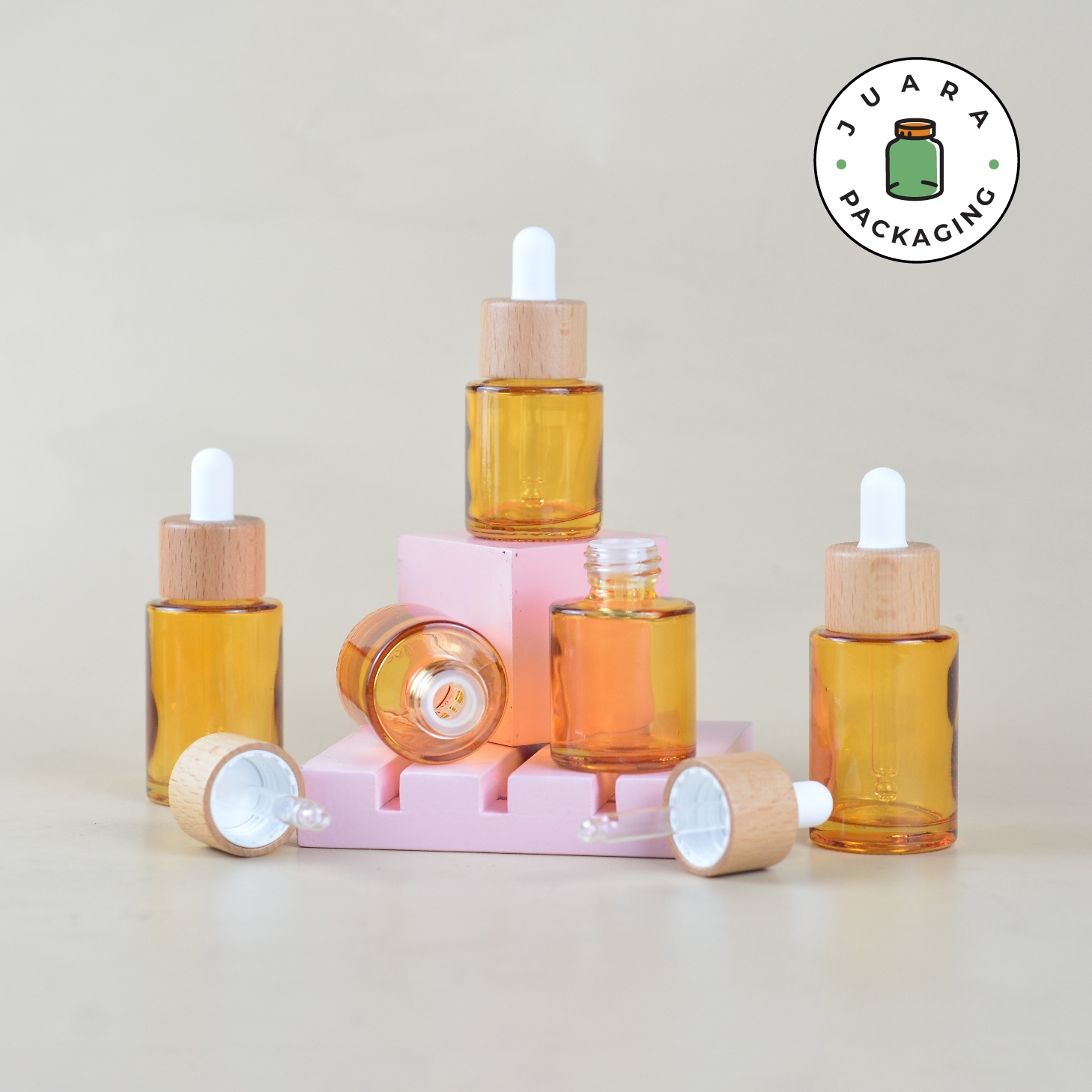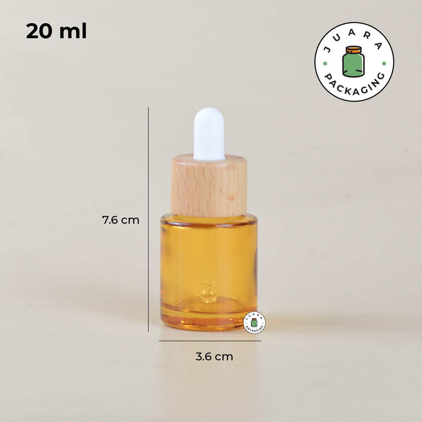 Botol Kaca 20ml dan 30ml ini hadir dengan desain kaca kuning bening glossy yang elegan. Dilengkapi tutup pipet karet putih dengan ring kayu, kemasan produk ini memberikan kesan alami dan eksklusif. Cocok untuk serum atau skincare, menjaga kualitas produk dengan tampilan yang menarik dan fungsional.