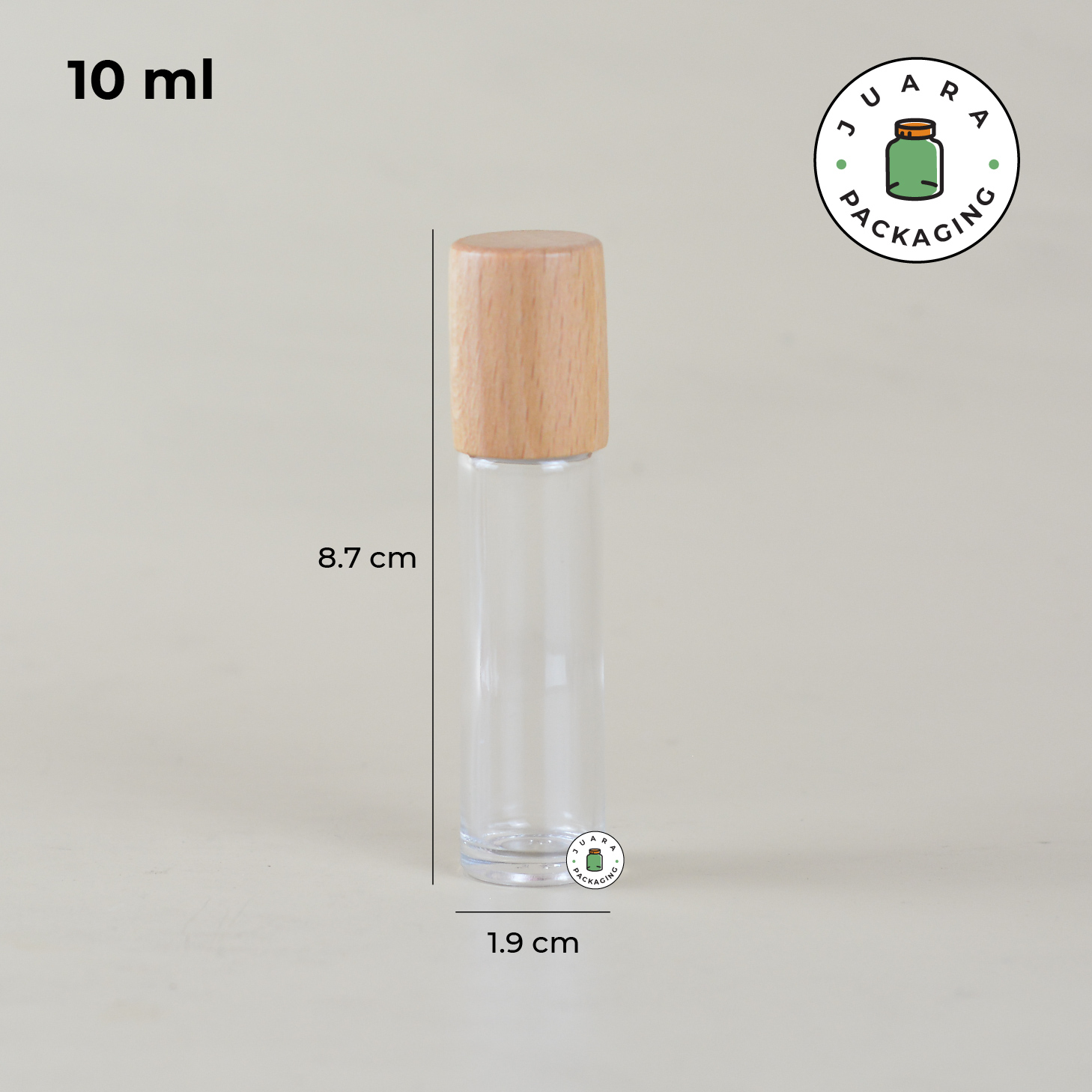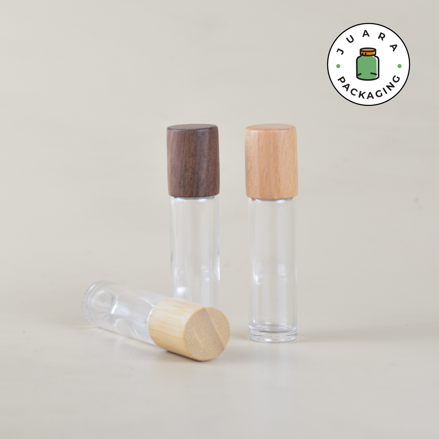 Botol Kaca Roll On 10ml – Botol Parfum Bening Transparan Clear dengan Roller Stainless & Tutup Aksen Kayu 3 Warna | Wadah Minyak Angin Parfum Rollon Isi Ulang 10 ml