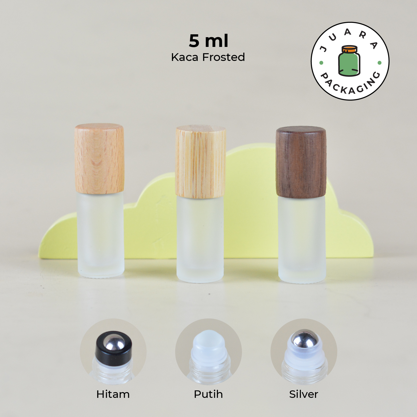 Botol Kaca Roll On 5ml – Botol Parfum Mini Kaca Buram Matte Doff dengan Roller Stainless dan Tutup Aksen Kayu 3 Warna | Wadah Minyak Angin Parfum Rollon 5 ml