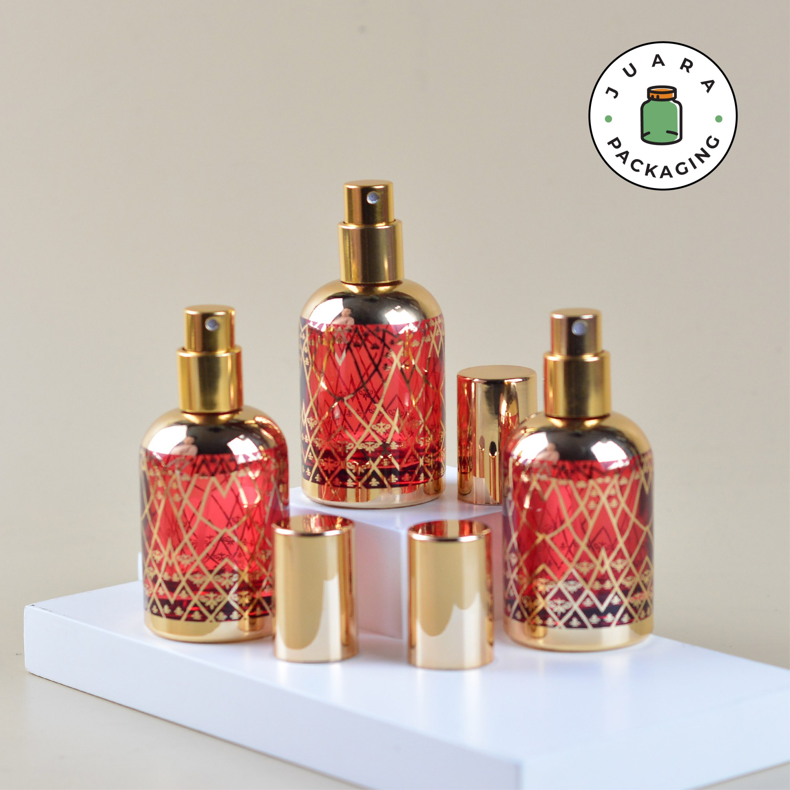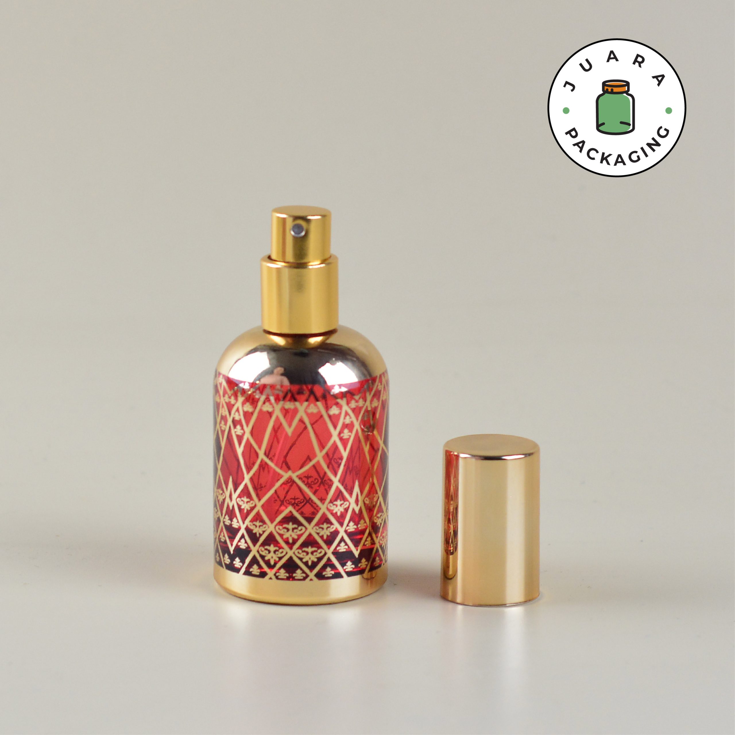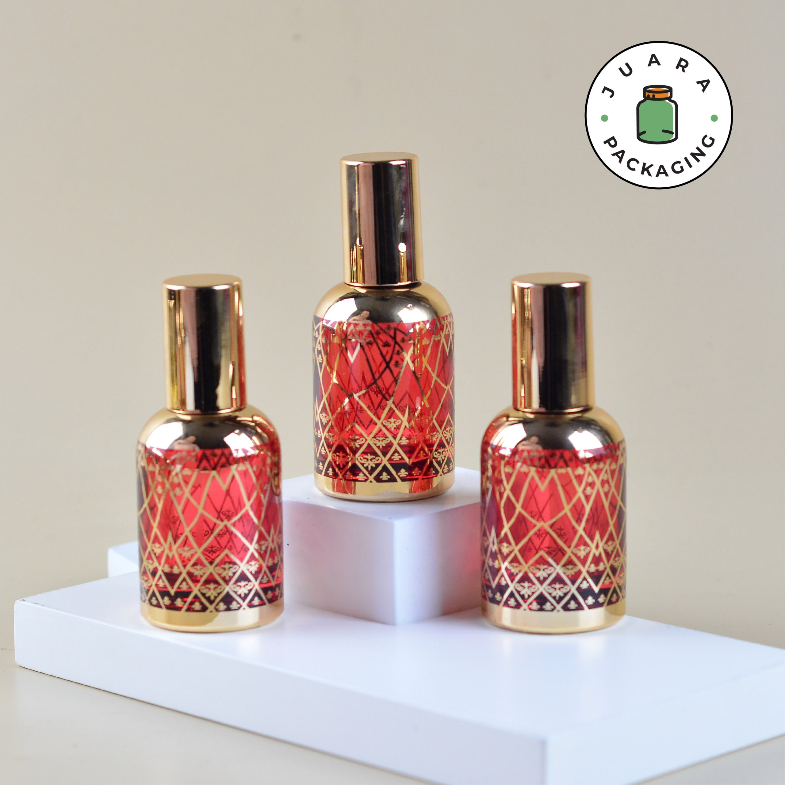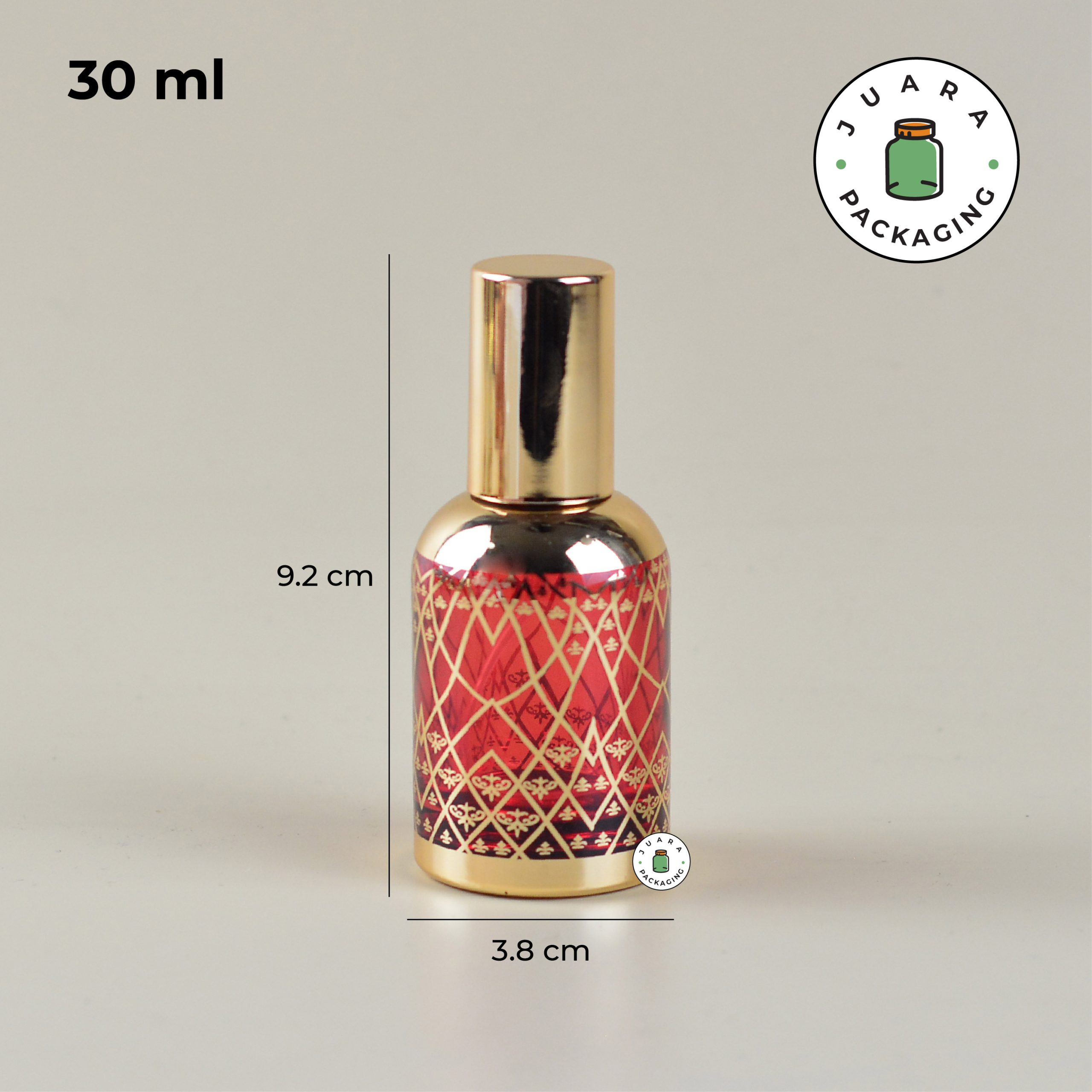 Botol Spray Kaca 30ml dengan desain bulat merah dan motif emas ini memberikan sentuhan elegan khas Arab. Kemasan produk ini, terbuat dari kaca tebal berkualitas tinggi, menjamin ketahanan dan keindahan. Sempurna untuk menyimpan parfum Anda dengan gaya yang mewah dan eksklusif.