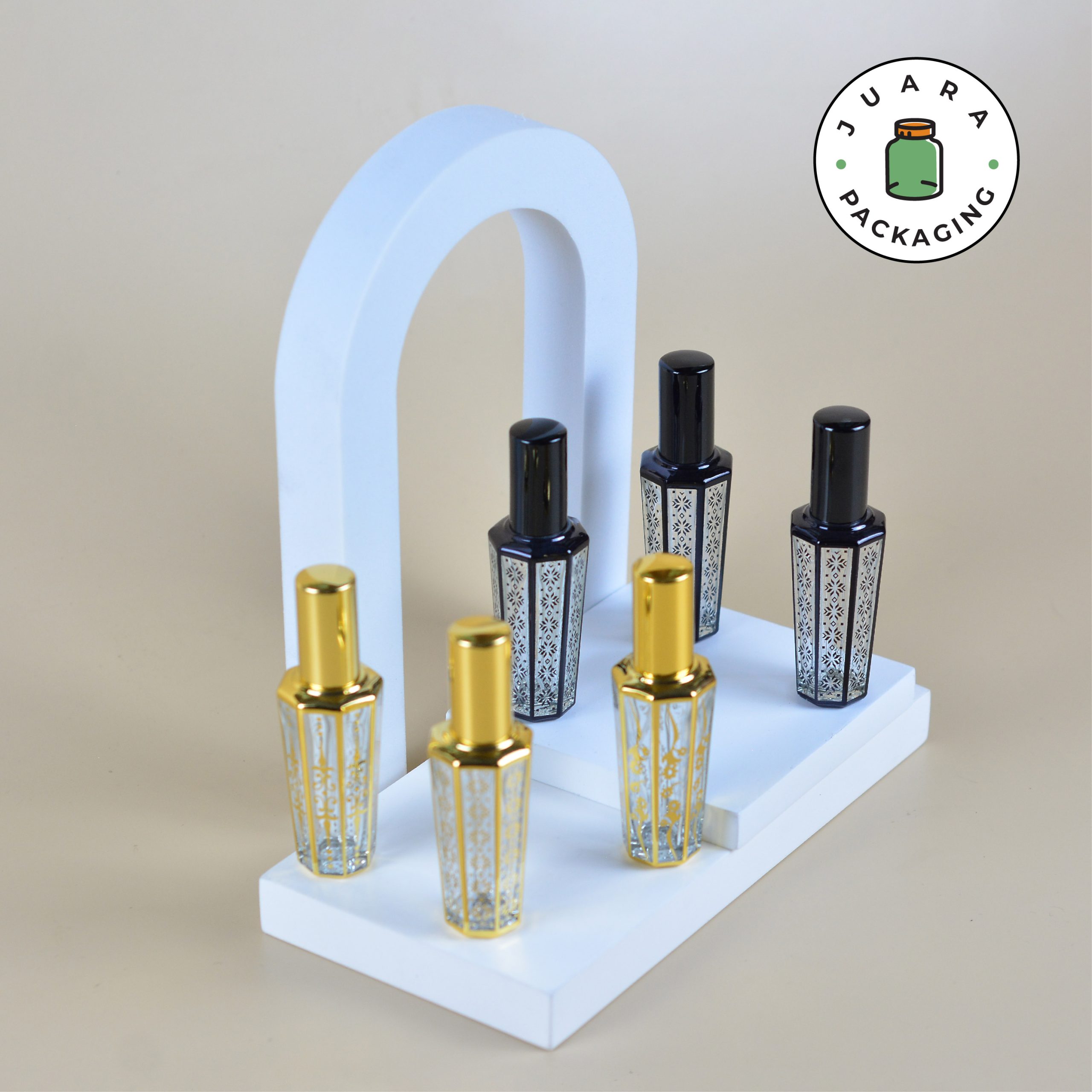Botol Parfum Spray Kaca 15ml dengan motif batik unik Arab ini hadir dalam warna gold dan hitam, memberikan sentuhan elegan dan eksotis. Kemasan produk yang indah ini tidak hanya praktis, tetapi juga menonjolkan keunikan dan keindahan budaya, menjadikannya pilihan sempurna untuk parfum eksklusif Anda.
