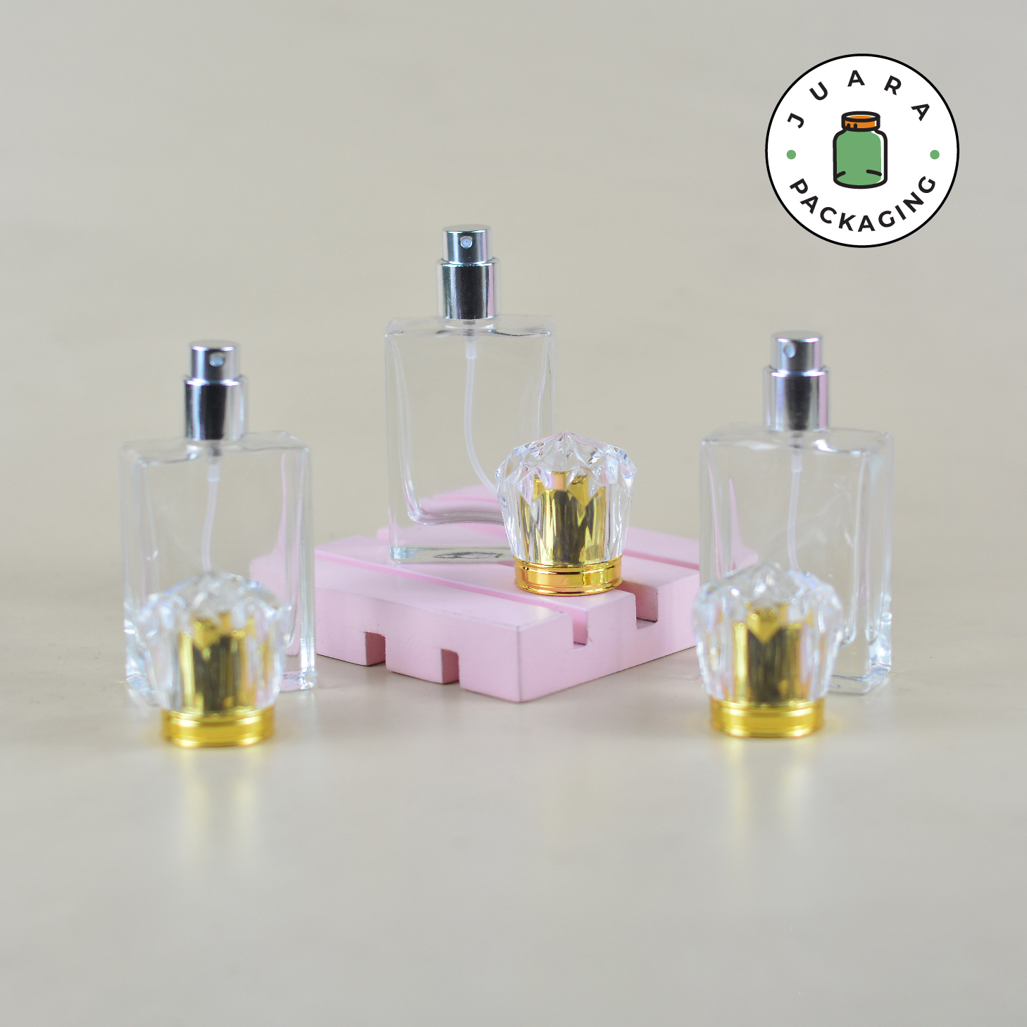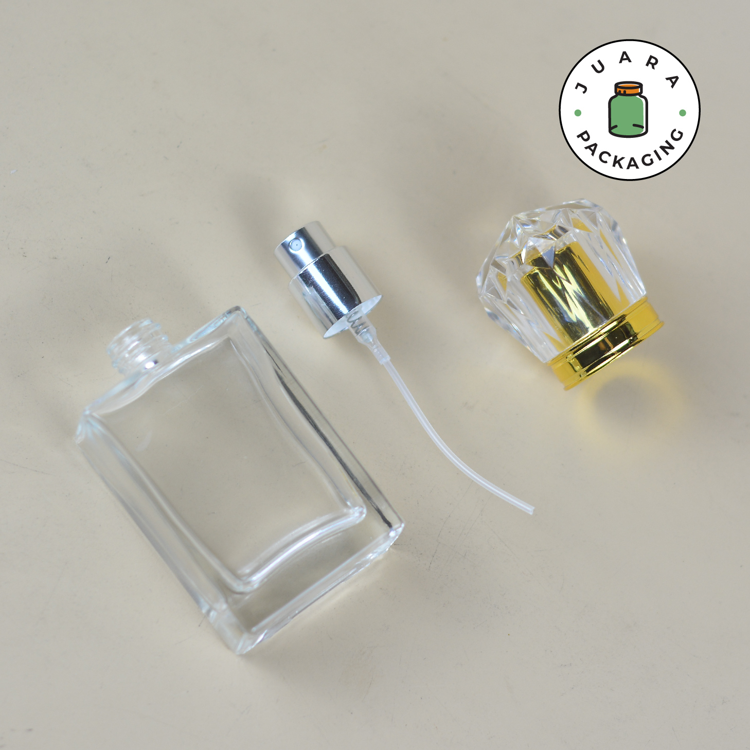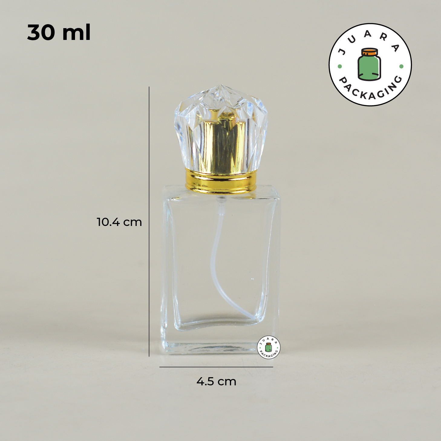 Botol Parfum Spray 30ml berbentuk kotak dari kaca tebal ini dilengkapi spray ulir silver dan tutup mahkota (crown) double wall, menciptakan kesan premium dan elegan. Kemasan produk ini ideal untuk parfum eksklusif, menjaga aroma tetap tahan lama dengan tampilan mewah yang memikat perhatian pelanggan.