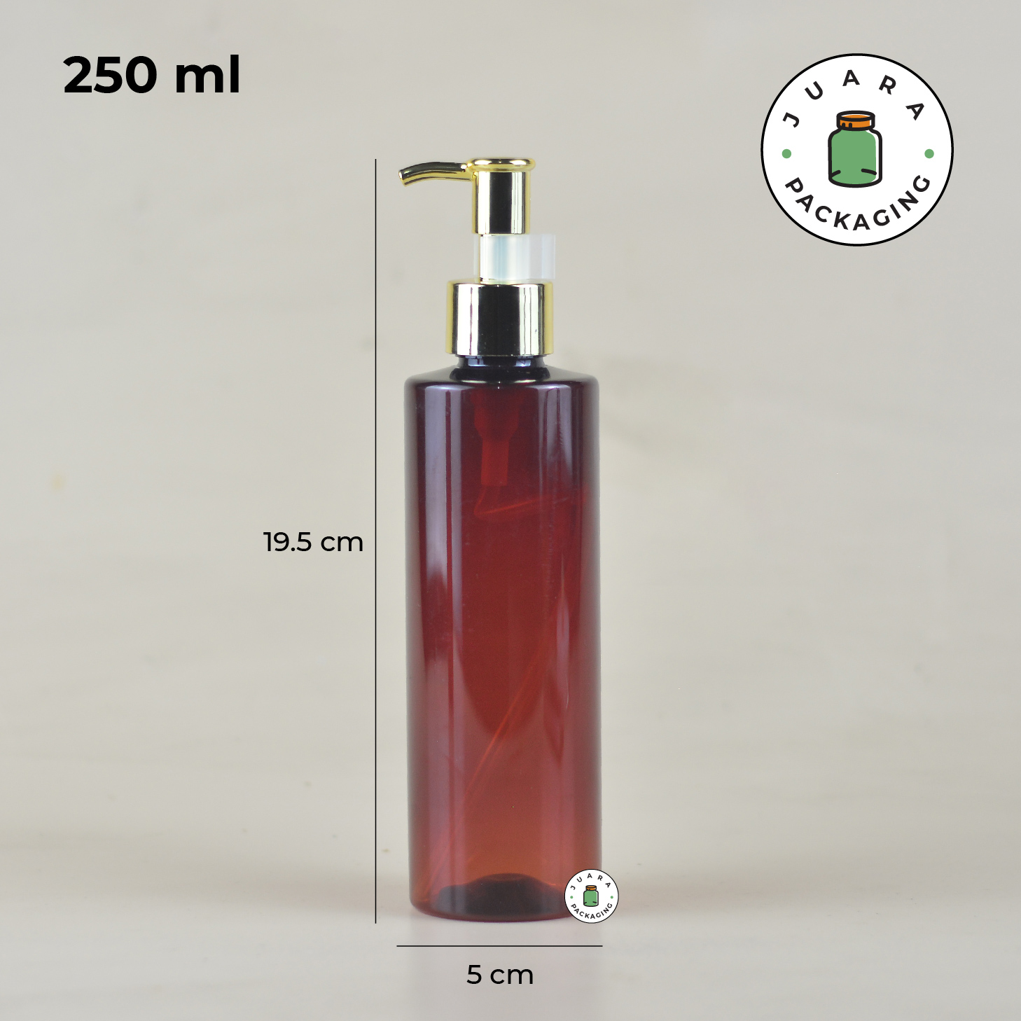 Botol Plastik Coklat Pump Gold 250ml – Wadah Sabun Cair Shampoo Lotion Skincare Minyak Aromaterapi Refill Botol Kosmetik Isi Ulang Elegan Tebal dengan Tutup Pump Warna Emas Premium