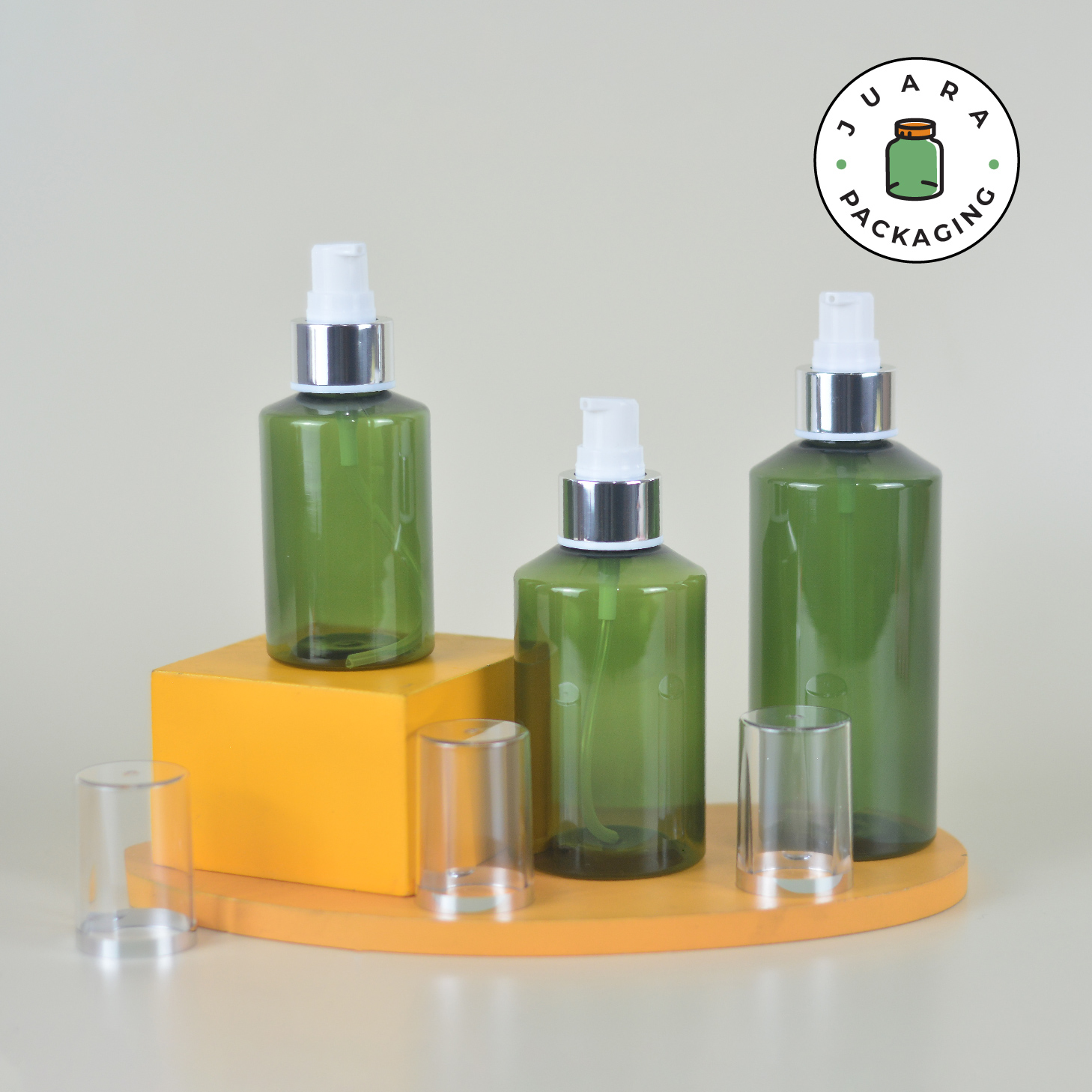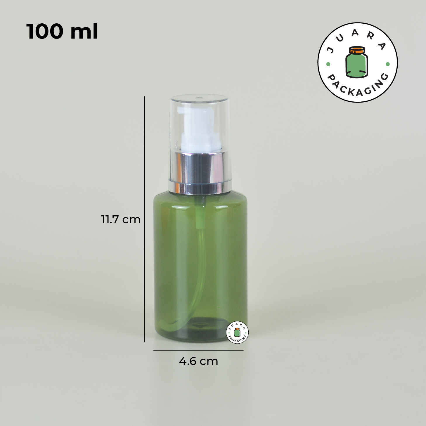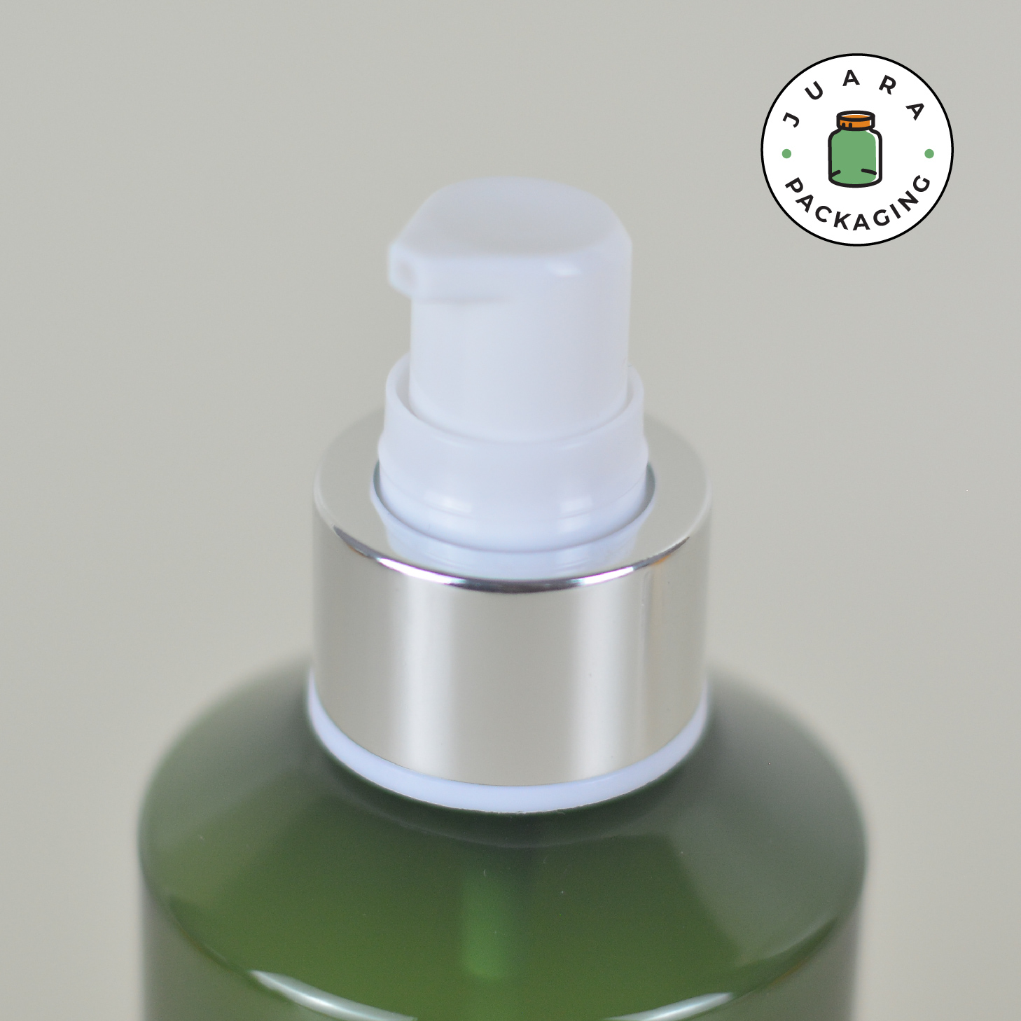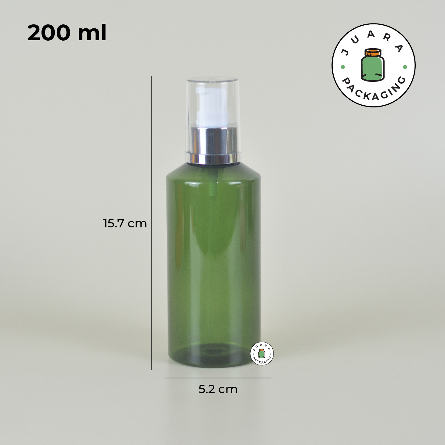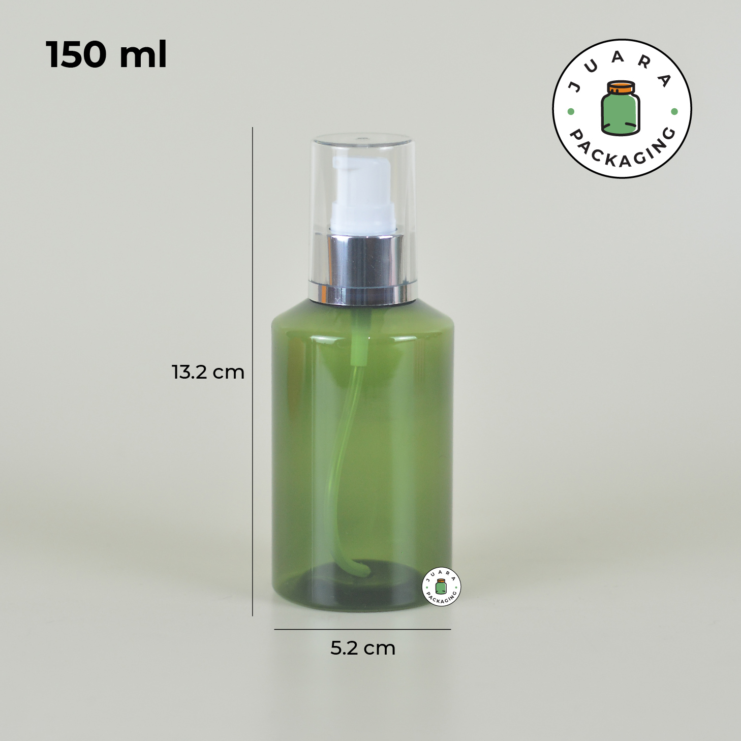 Botol plastik PET warna hijau ini dilengkapi pump putih dengan tutup transparan list silver yang memberikan tampilan bersih, modern, dan premium. Tersedia dalam tiga ukuran (100 ml, 150 ml, 200 ml), botol ini cocok untuk kebutuhan isi ulang rumah tangga maupun bisnis skincare.