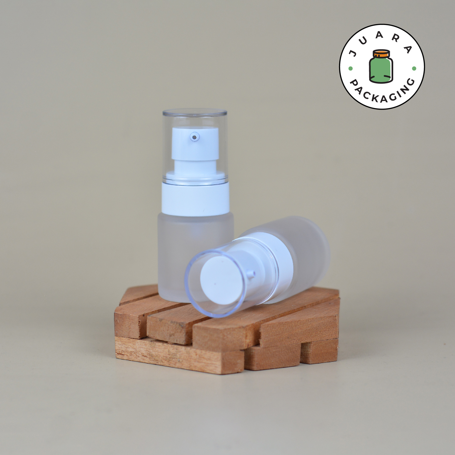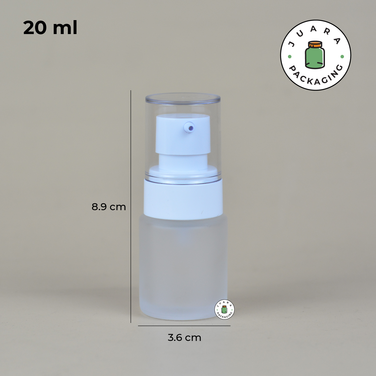 Botol Pump Kaca 20ml ini memiliki desain kaca frosted buram yang elegan dengan tutup pump putih. Terbuat dari kaca tebal, kemasan produk ini ideal untuk menyimpan lotion atau cairan kosmetik lainnya. Tampilannya yang mewah dan fungsional menjadikan botol ini pilihan tepat untuk perawatan sehari-hari.