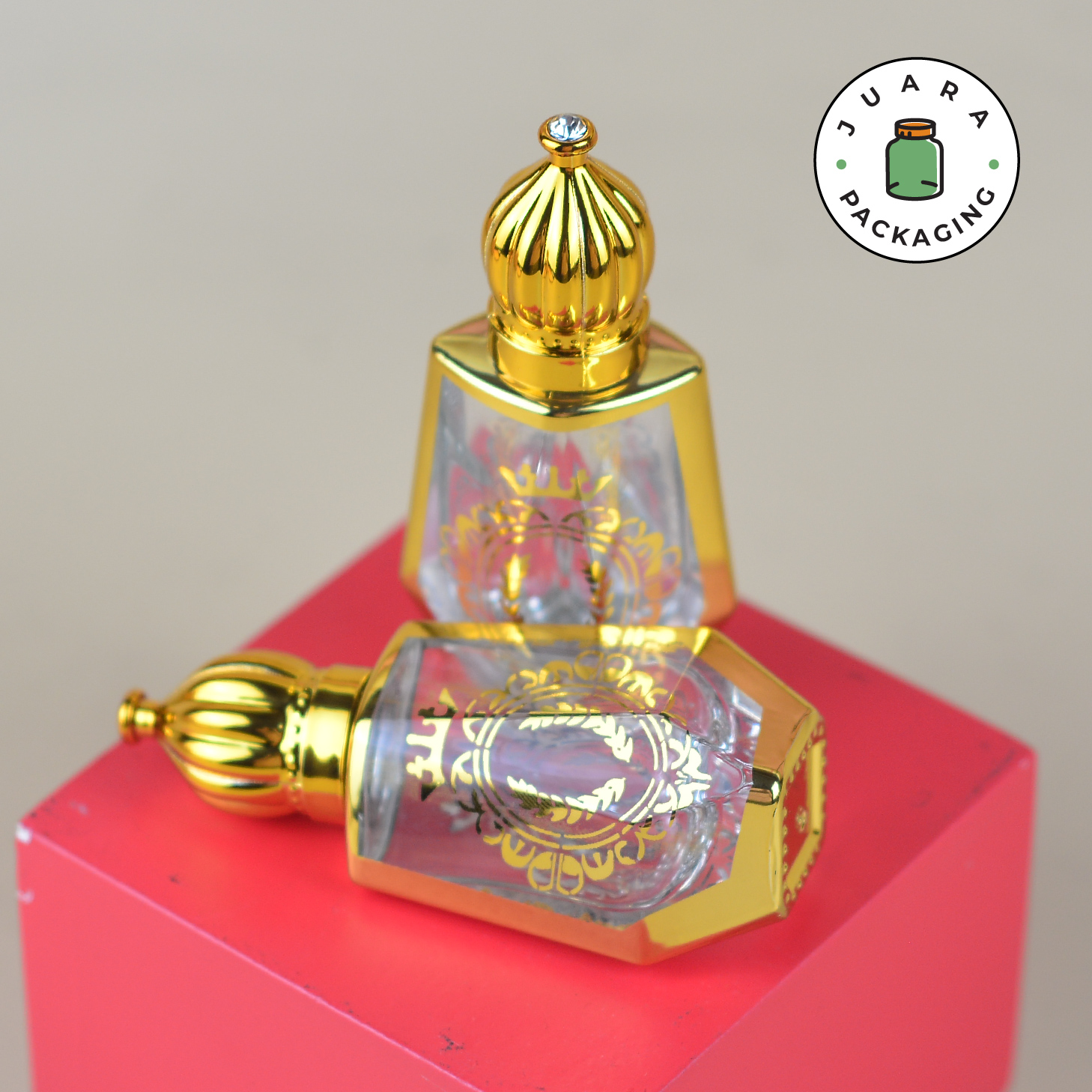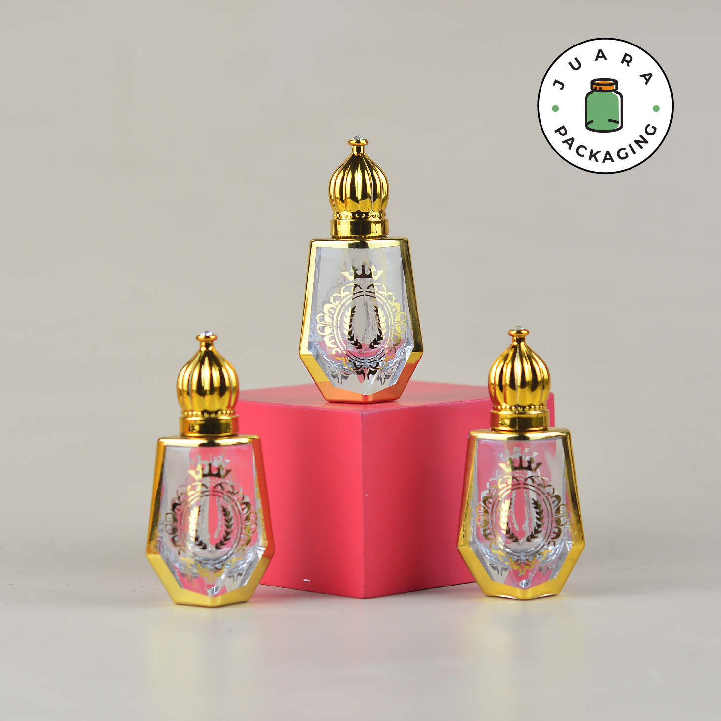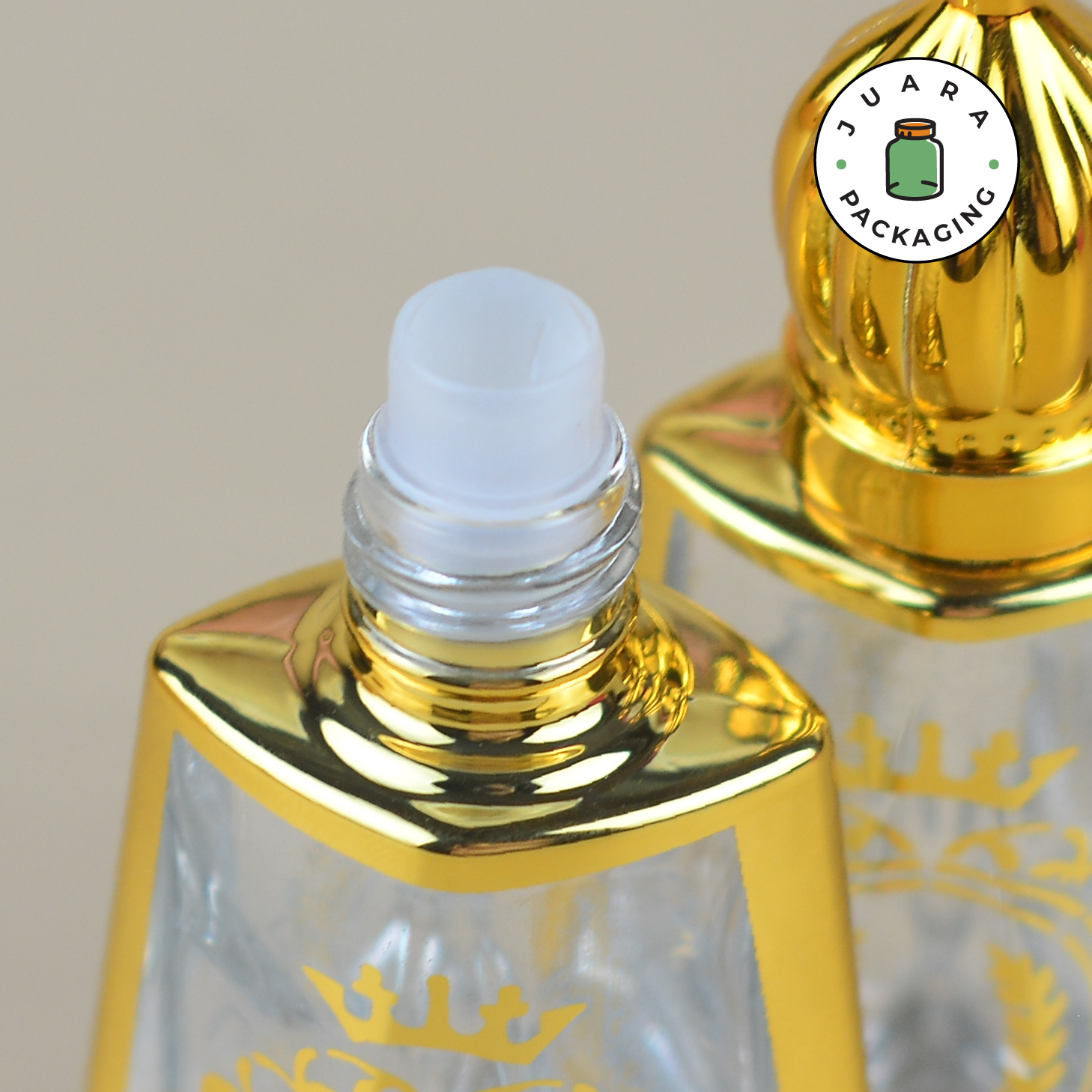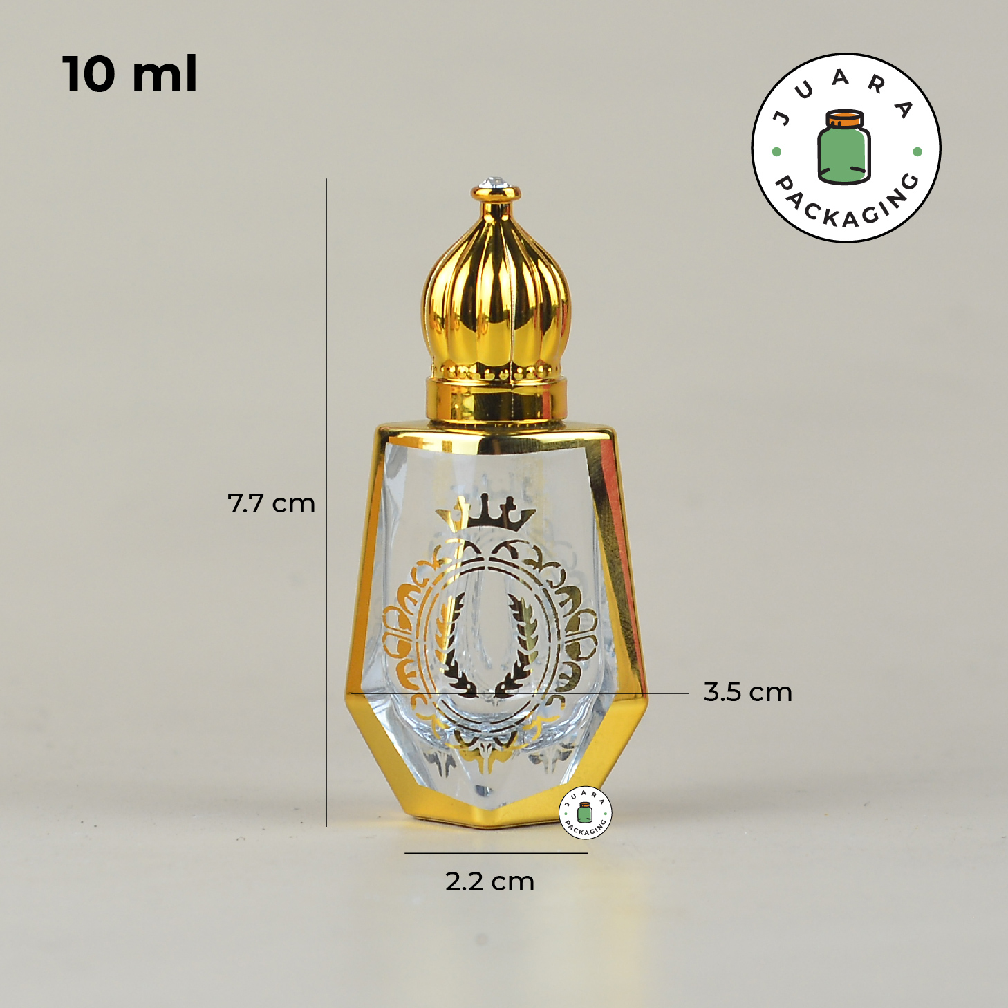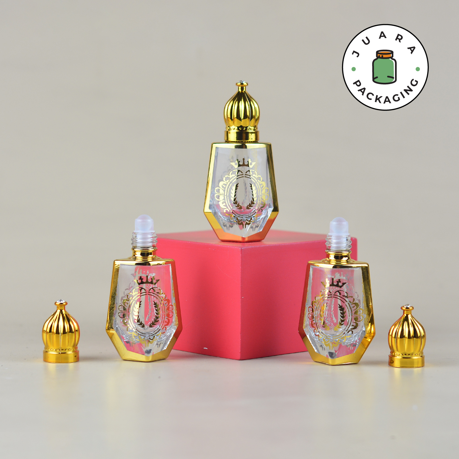 Botol Kaca Gold 10ml dengan aksen gold dan tutup mahkota crown menghadirkan kemasan produk yang mewah dan elegan. Dilengkapi roller untuk aplikasi praktis, botol ini cocok untuk minyak wangi atau essential oil. Sentuhan aksen Arab menambah kesan eksklusif, ideal untuk produk berkualitas premium.