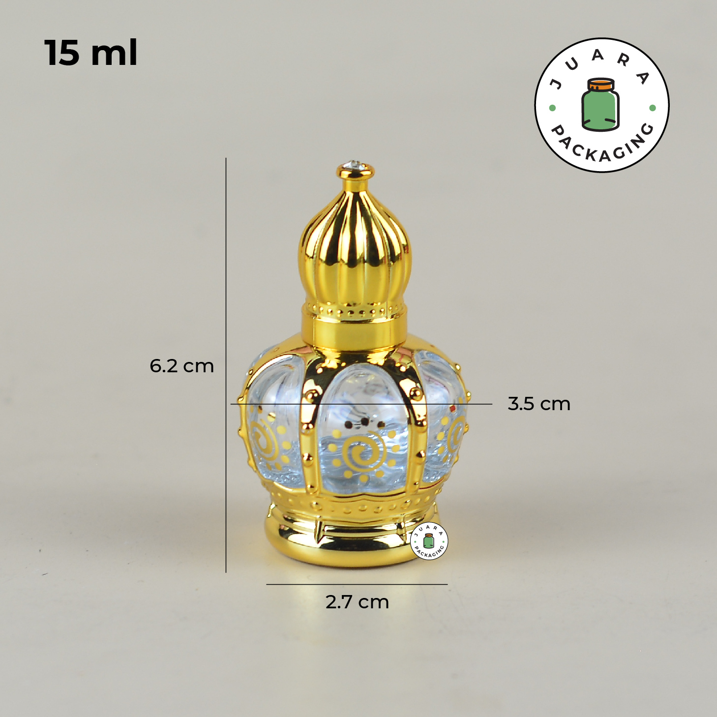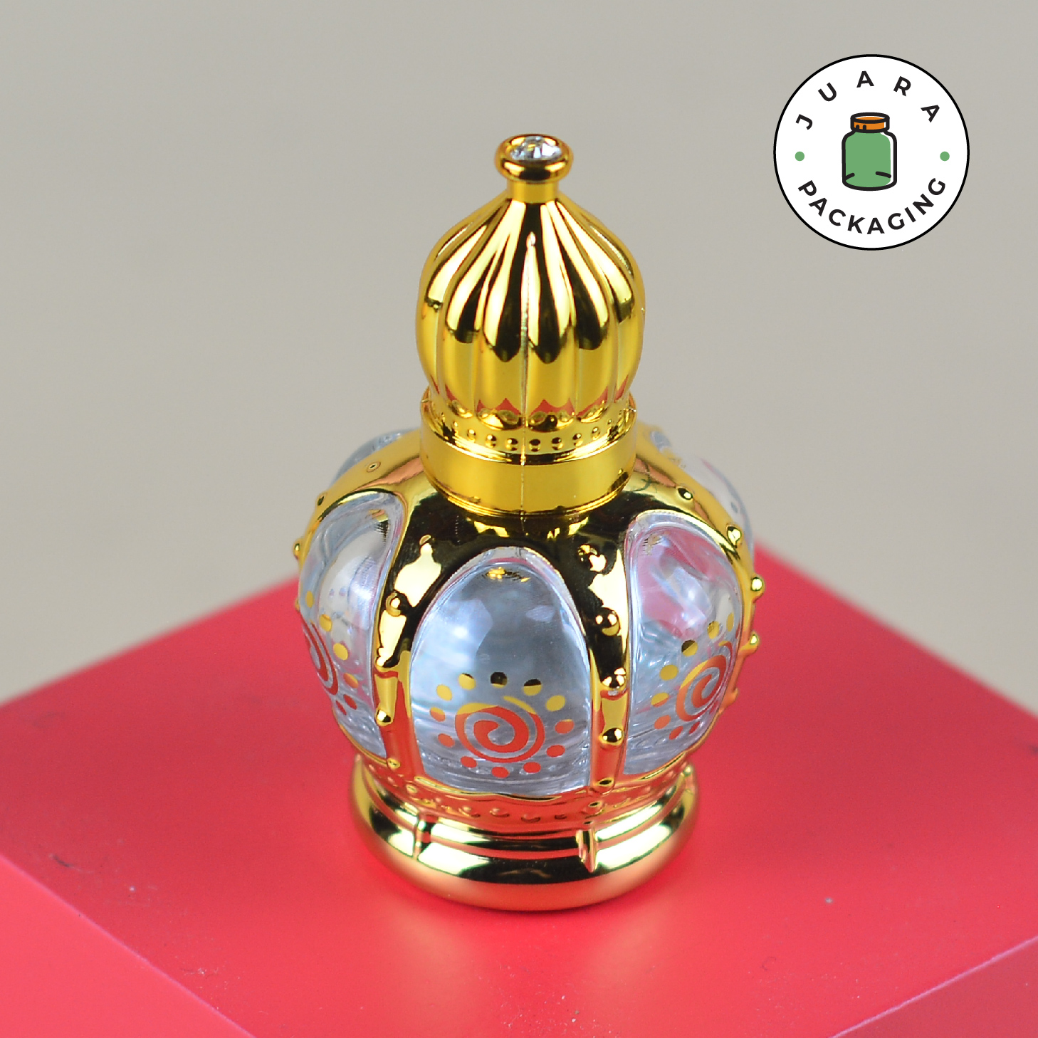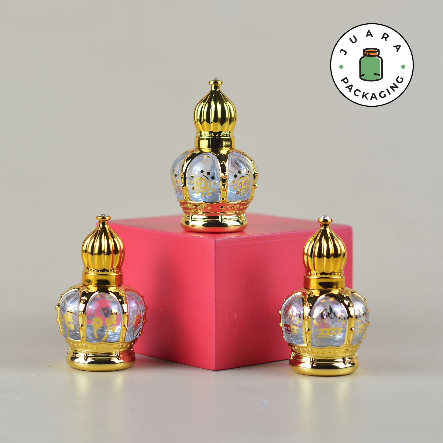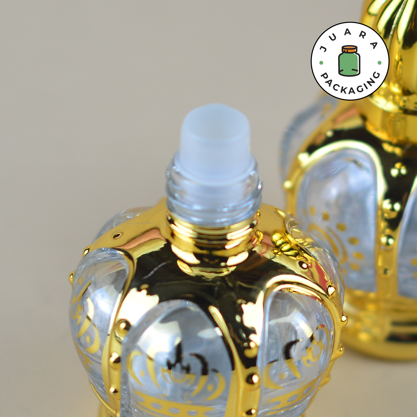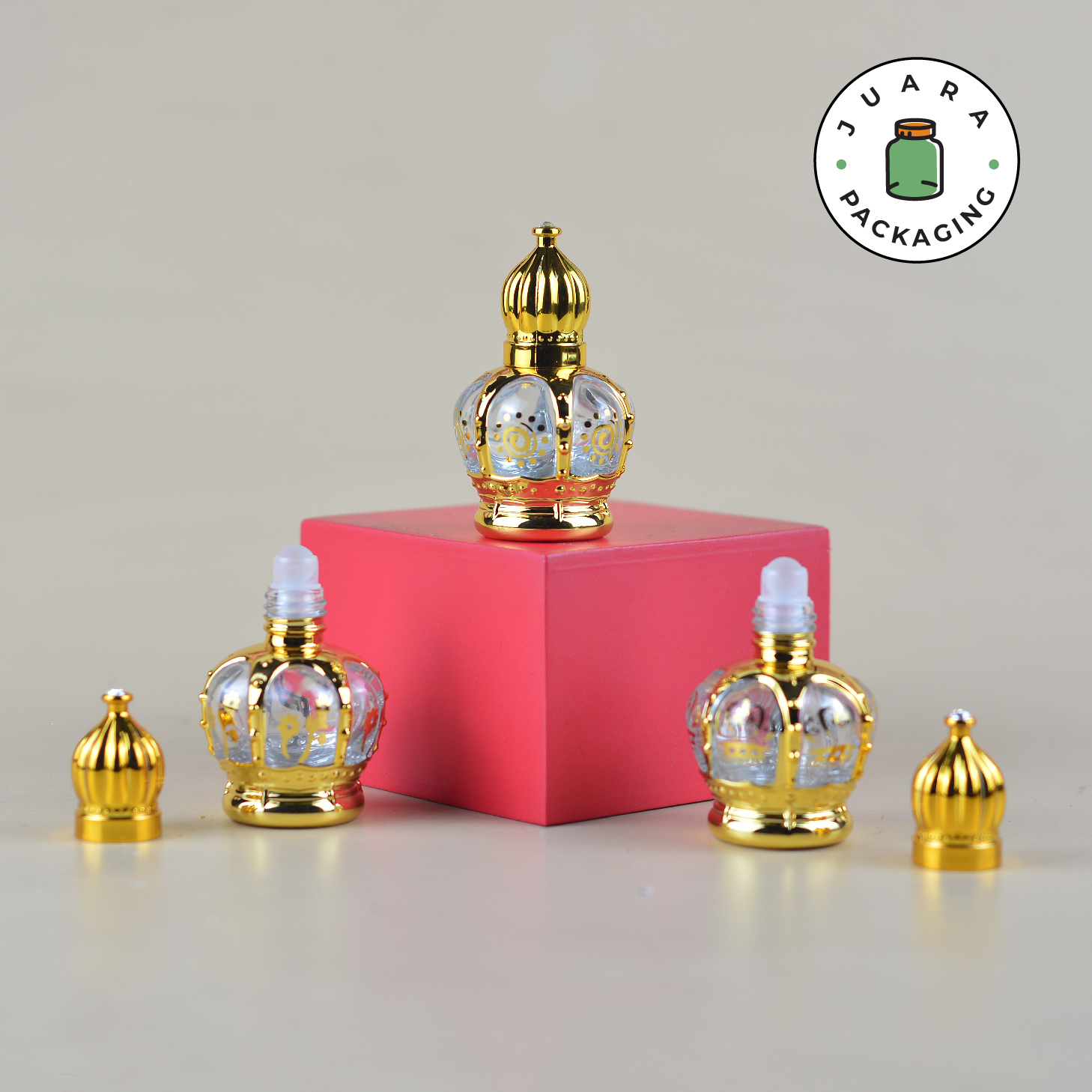 Botol Kaca Crown 15ml hadir dengan desain elegan dan aksen gold, memberikan sentuhan mewah pada kemasan produk Anda. Dilengkapi roller untuk aplikasi yang praktis, botol kaca mahkota ini cocok untuk minyak wangi atau essential oil. Sentuhan aksen Arab menambah kesan eksklusif dan berkelas.