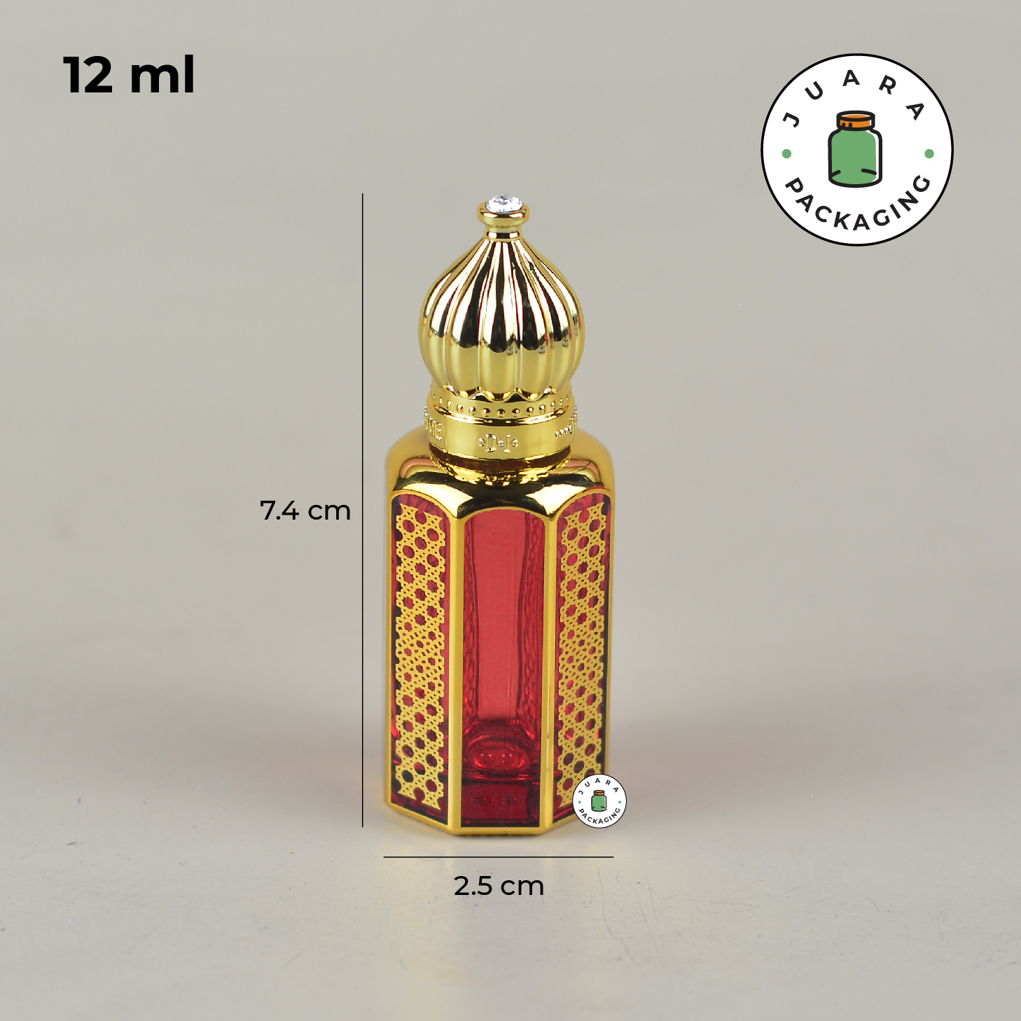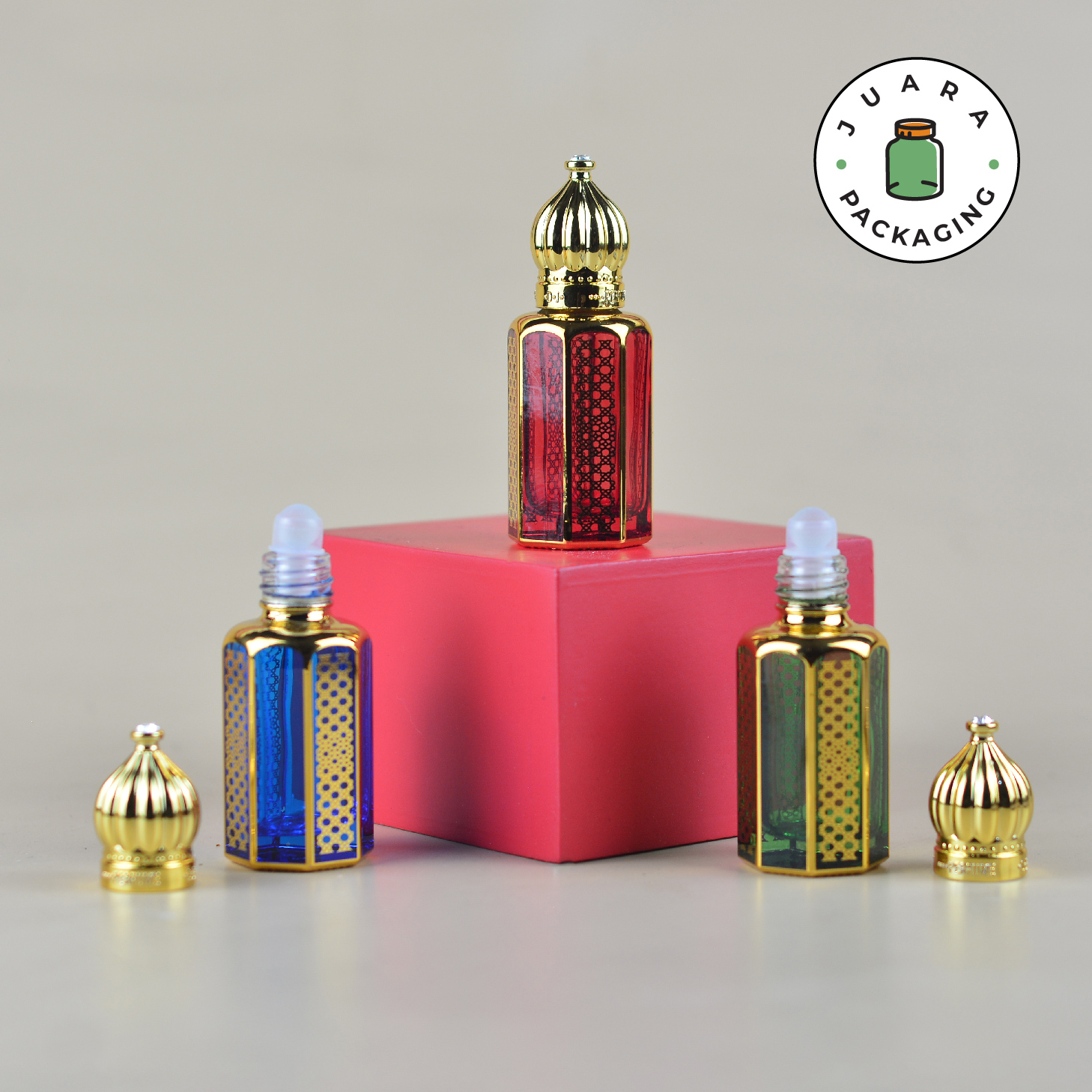 Botol Kaca Roll On 12ml dengan tutup kubah emas gold dan aksen batik Arab menghadirkan kemasan produk yang mewah dan elegan. Tersedia dalam warna biru, merah, dan hijau, botol ini dilengkapi roller untuk aplikasi praktis. Cocok untuk minyak wangi atau essential oil dengan desain eksklusif.