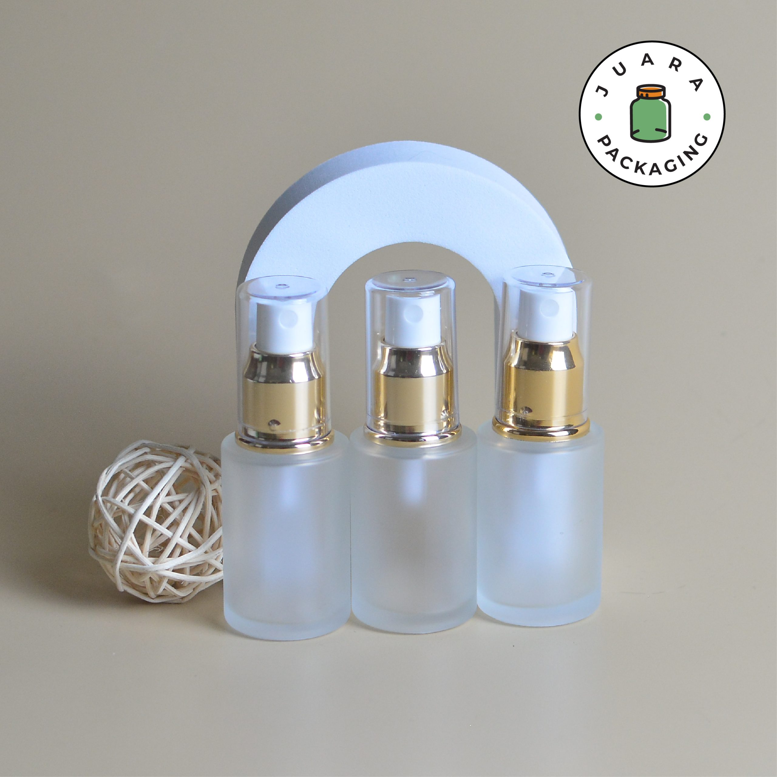 Botol kaca frosted berukuran 30ml dengan tampilan buram yang elegan dan tebal. Dilengkapi dengan spray pump dan berbagai pilihan tutup. Cocok untuk berbagai produk seperti parfum atau skincare. Kemasan produk yang modern dan estetis, memberikan kesan eksklusif dan ramah lingkungan.