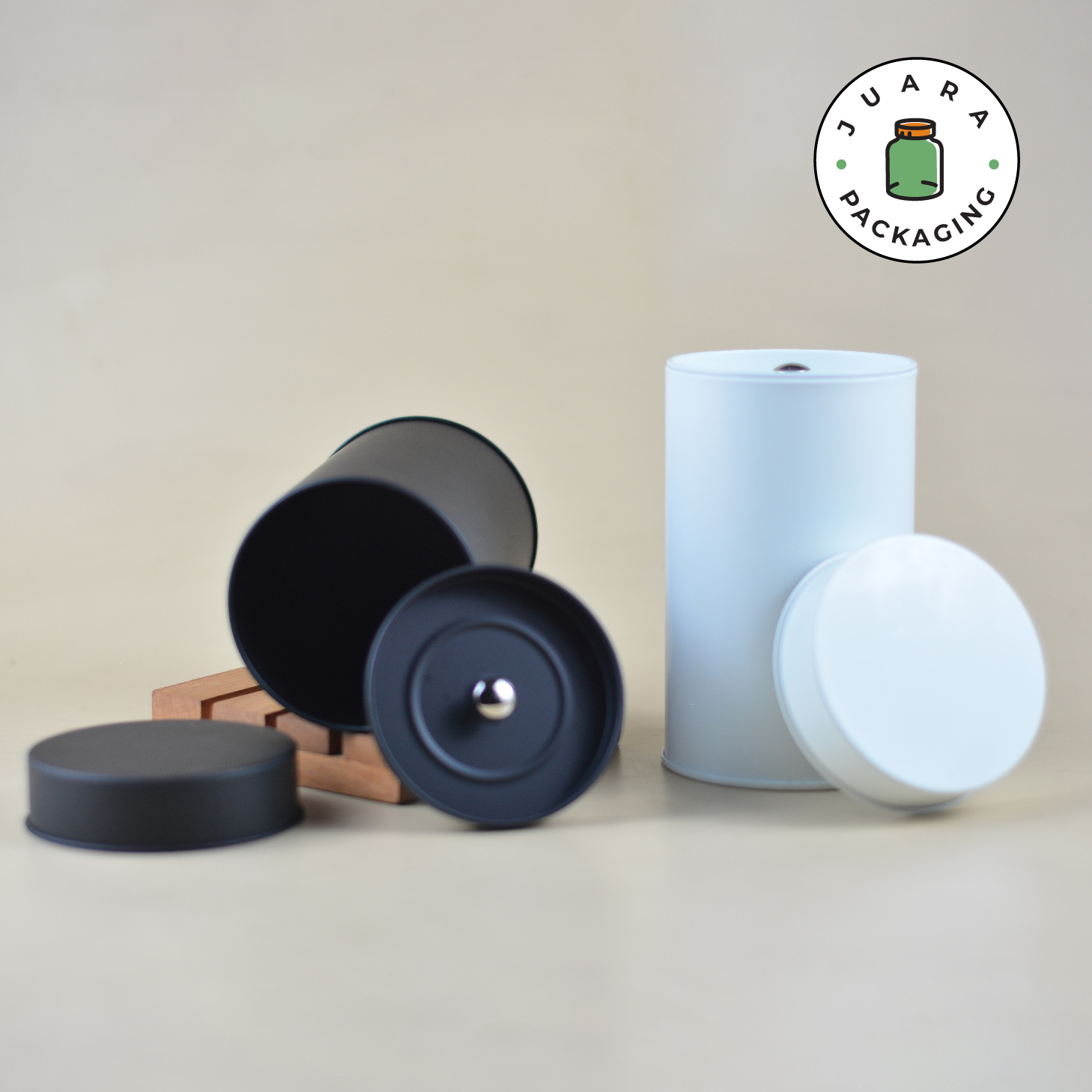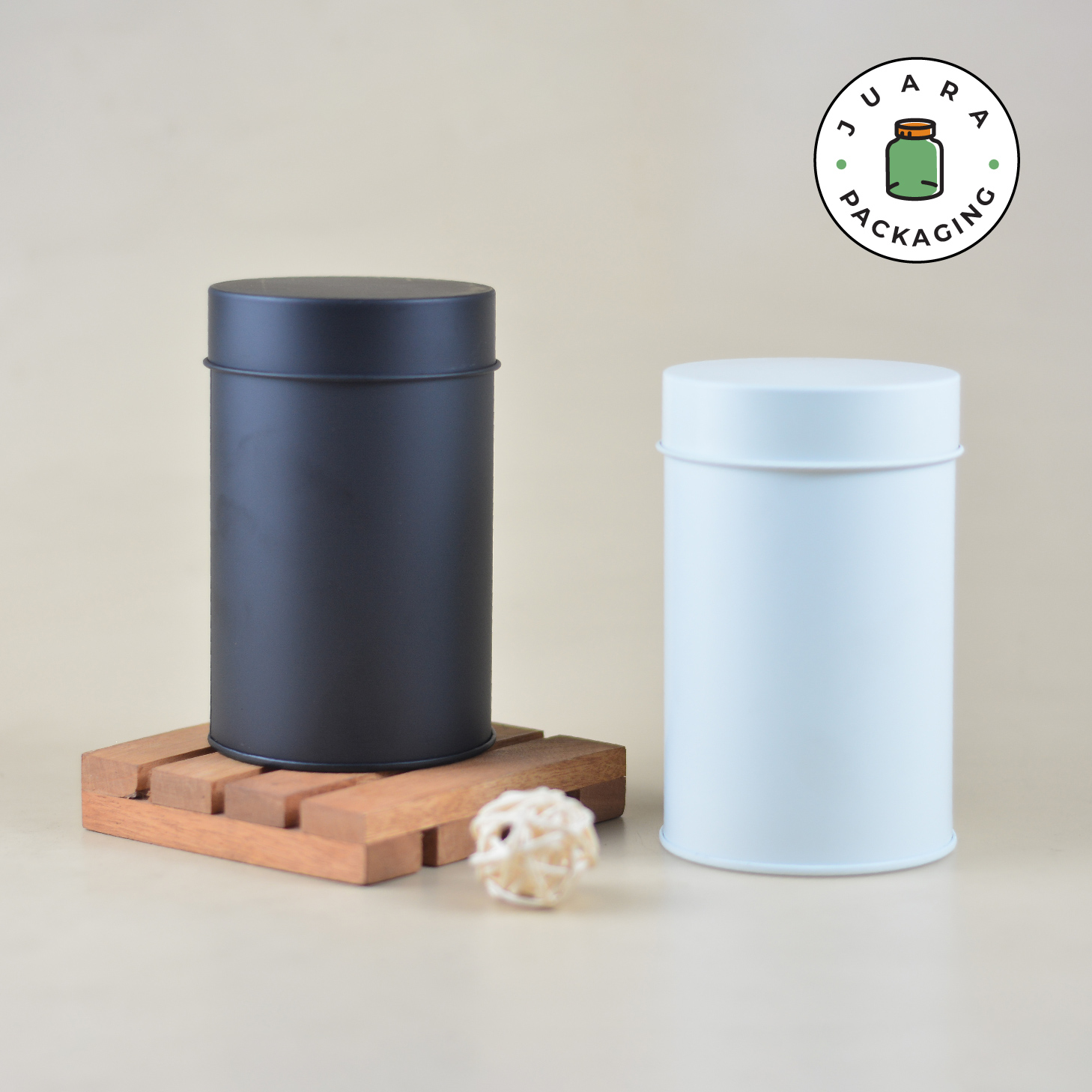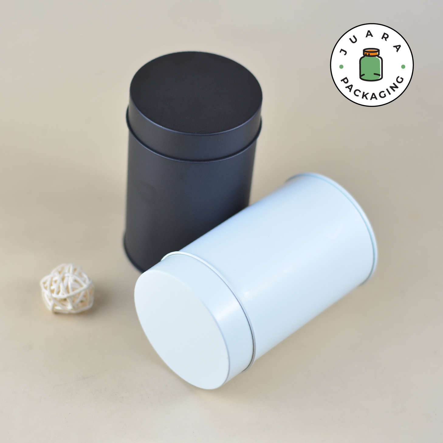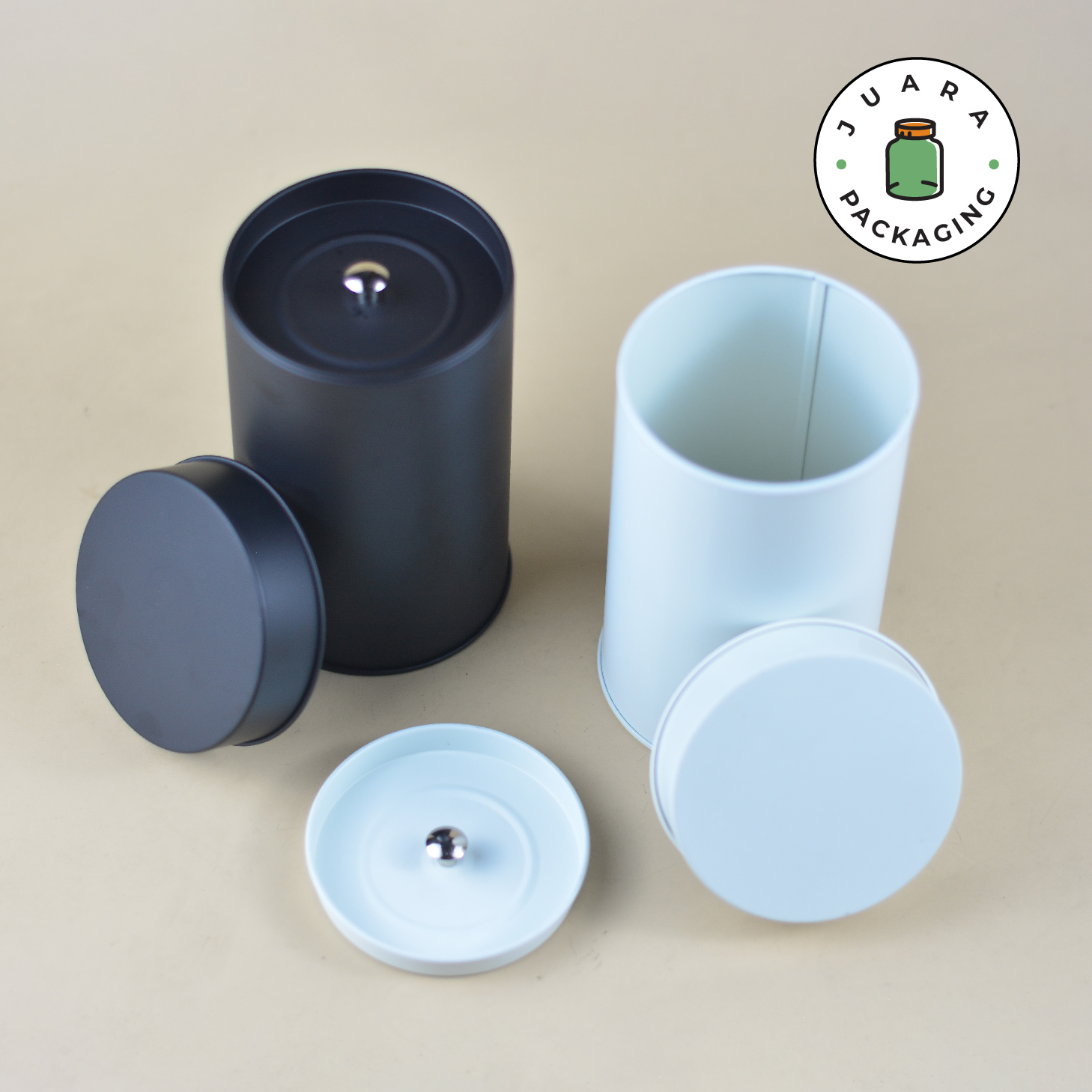 Jar Aluminium Silinder warna Hitam Doff & Broken White (Putih Tulang) ini hadir dengan desain minimalis dan tutup kedap udara. Terbuat dari bahan aluminium anti karat, cocok sebagai kemasan produk serbaguna untuk teh, kopi, rempah, lilin aromaterapi, dan hampers. Elegan, praktis, dan menjaga kesegaran isi.