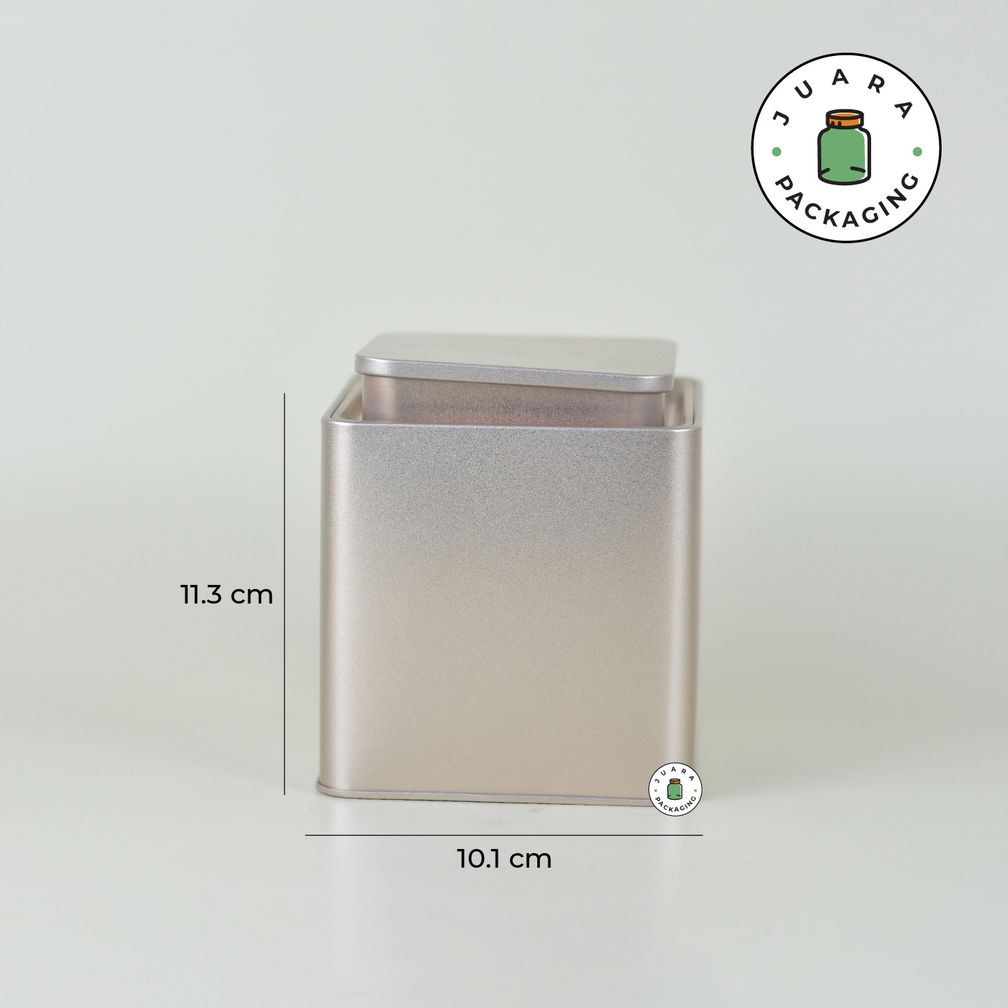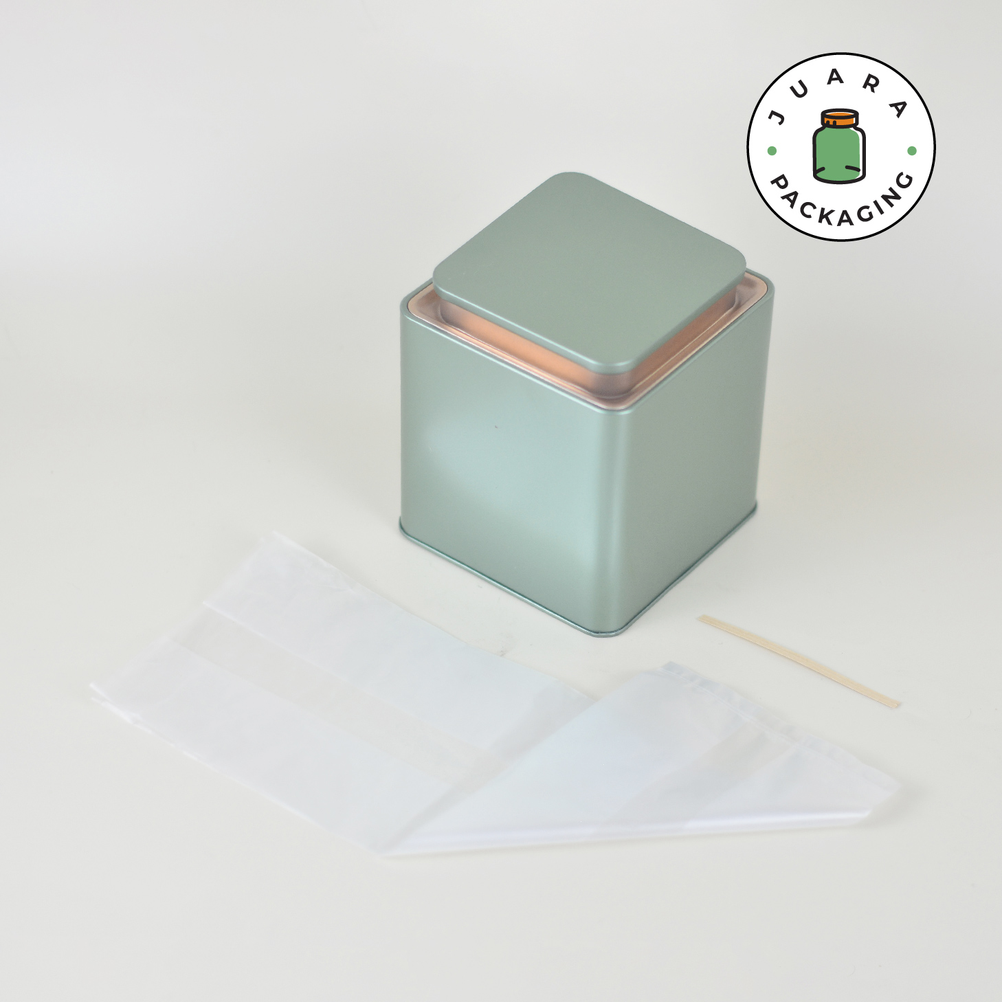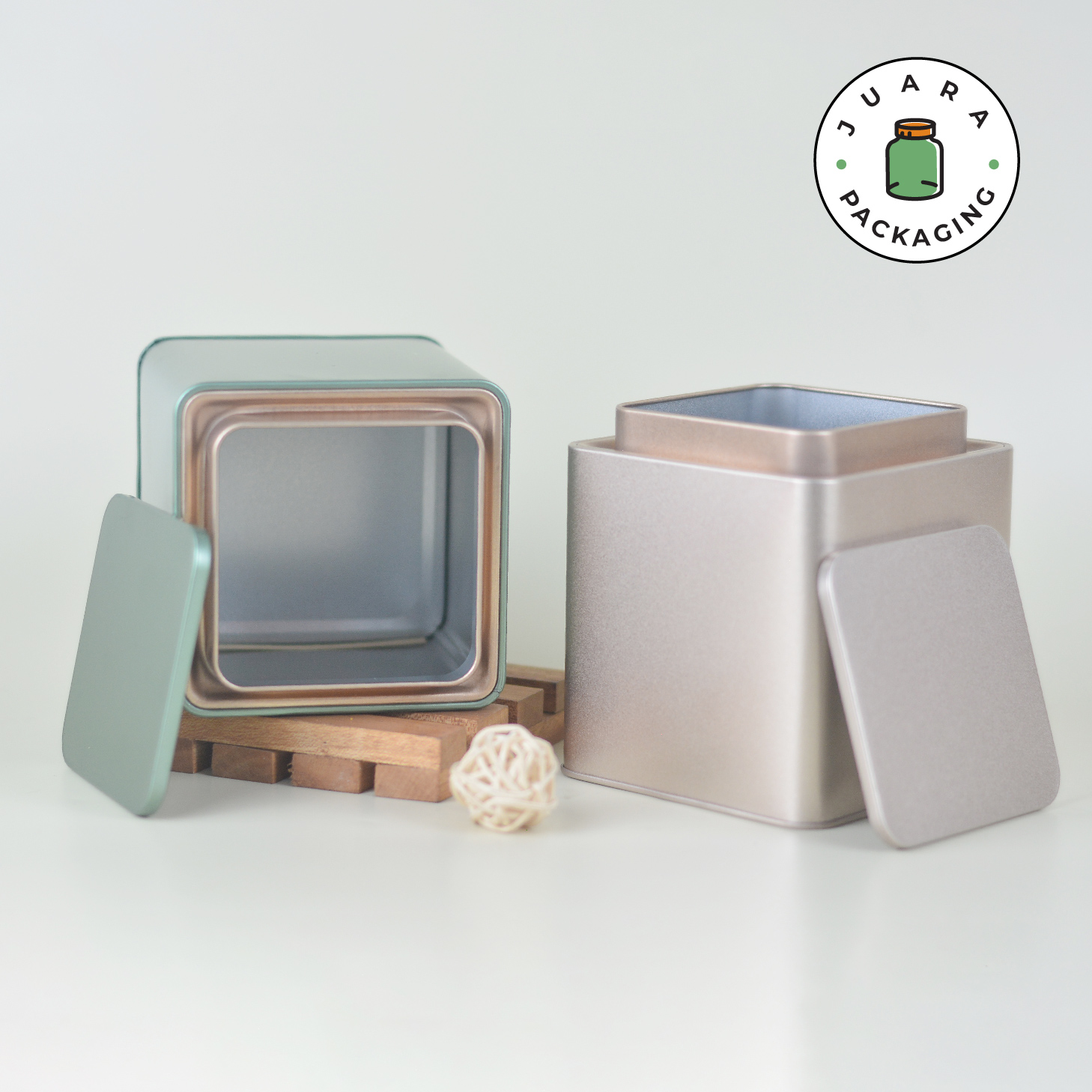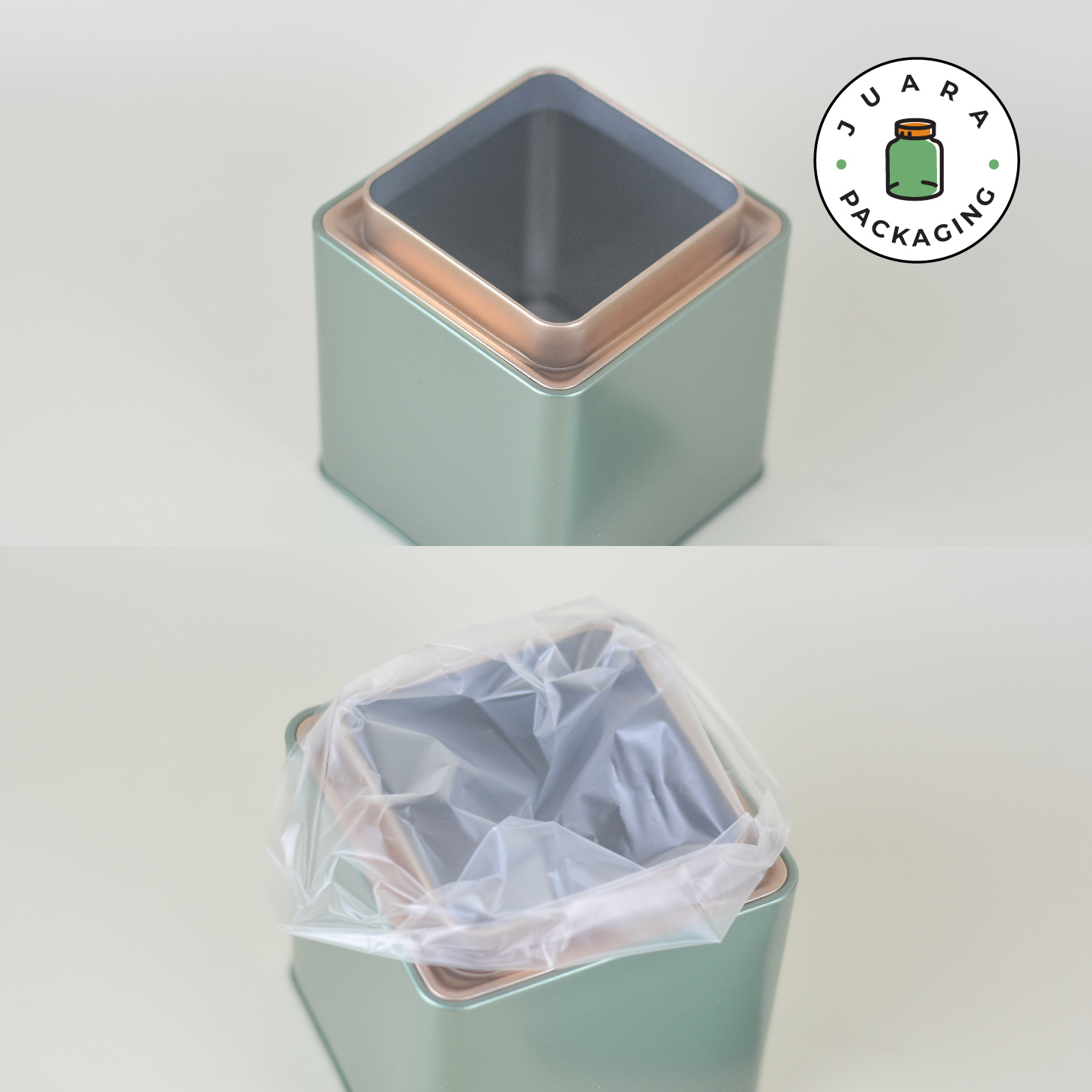 Jar Tin Can kotak warna hijau gold dengan inner plastik dirancang kedap udara untuk menjaga kesegaran isi. Cocok untuk matcha powder ceremonial grade, teh, kopi bubuk, bumbu, rempah, dan herbal. Desain elegan, kuat, serbaguna, ideal untuk isi ulang dan Kemasan Produk premium.