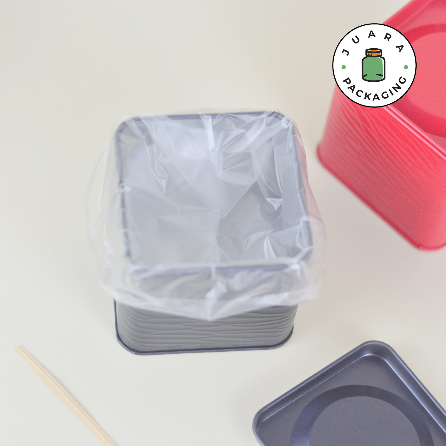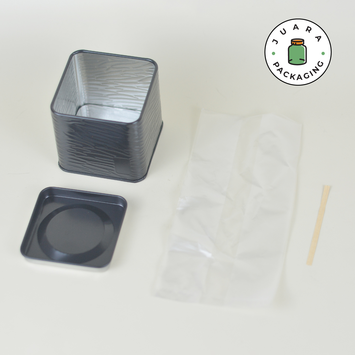 Jar Tin Can Kotak motif texture warna hitam merah biru dengan inner plastik dirancang kedap udara untuk menjaga kualitas isi. Cocok untuk matcha powder ceremonial grade, teh, kopi bubuk, bumbu, dan herbal. Material kuat, elegan, serbaguna untuk isi ulang. Pilihan ideal Kemasan Produk premium.