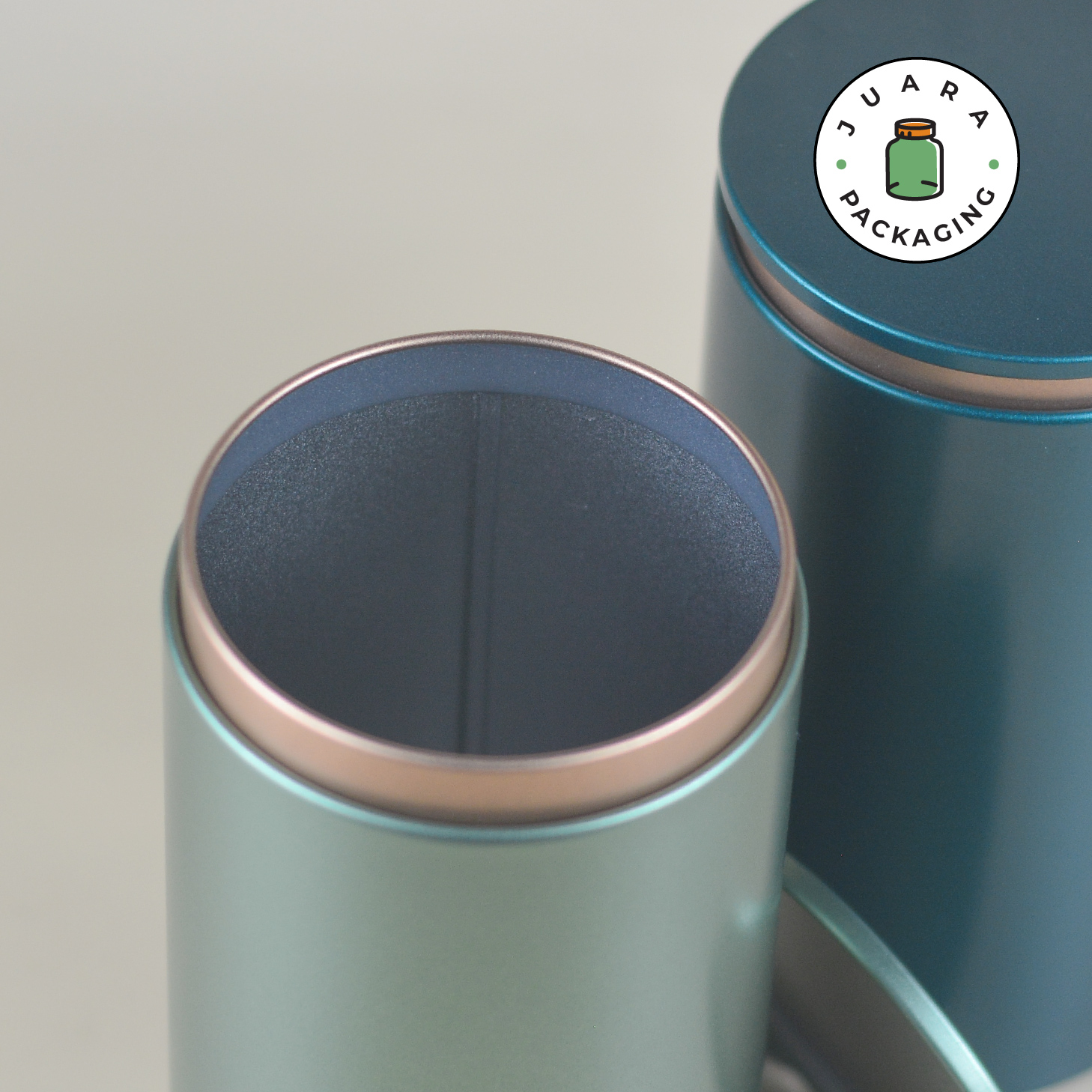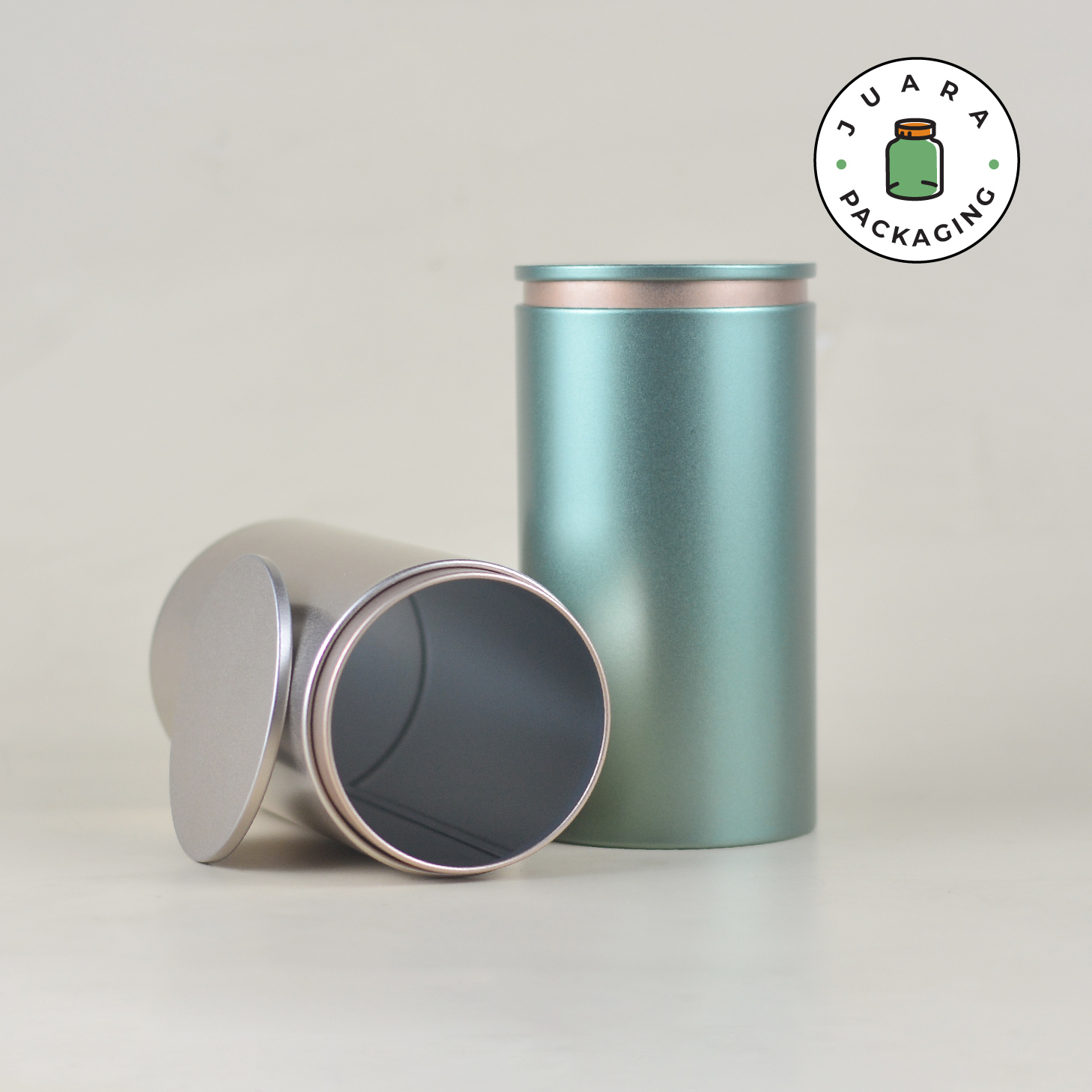 Jar Tin Can Silinder Tinggi Elegan – Wadah Matcha Powder Ceremonial Grade Pure 100% Tempat Teh Kedap Udara Kontainer Kopi Bubuk Rempah Herbal Minuman Serbuk Toples Kaleng Premium Isi Ulang Warna Gold Biru Hijau