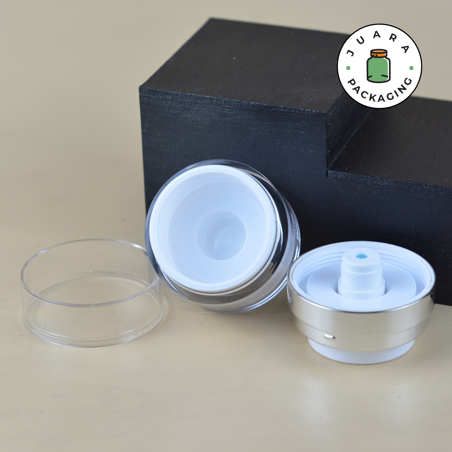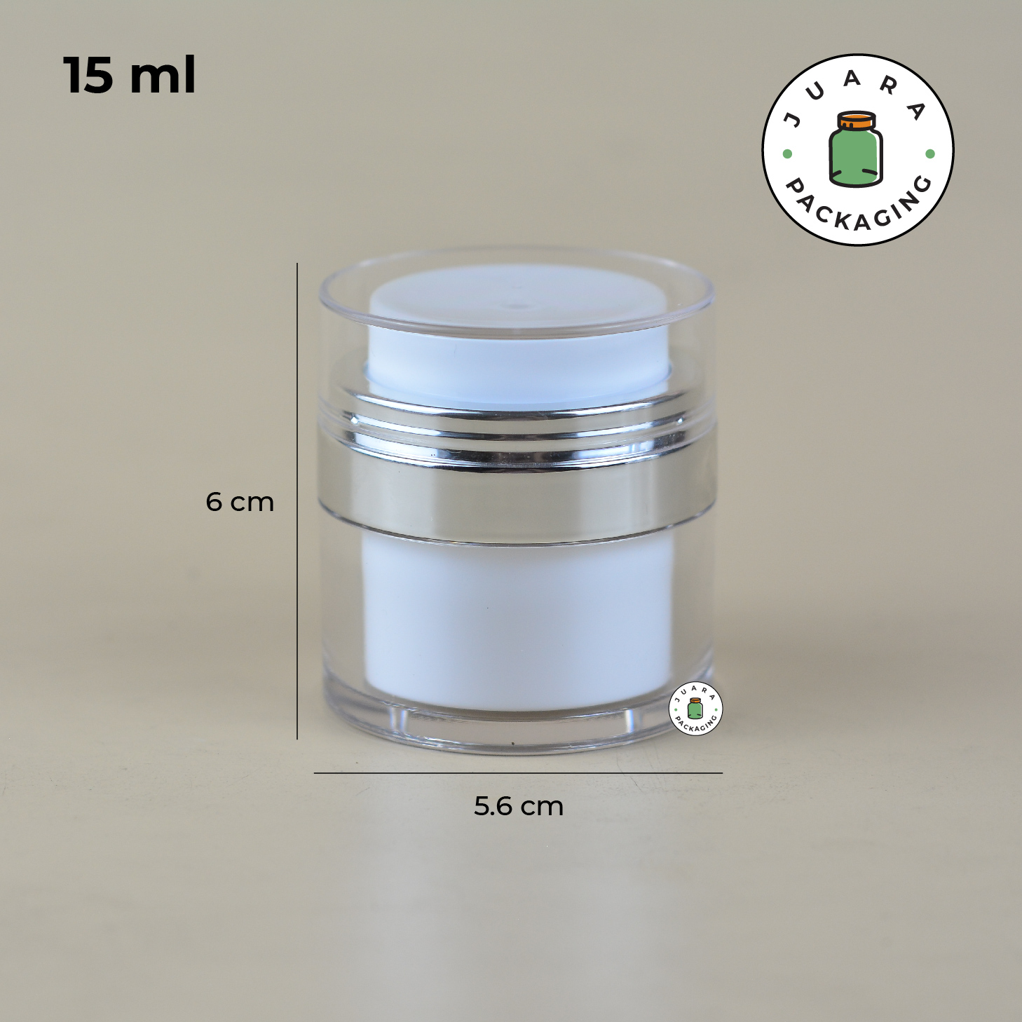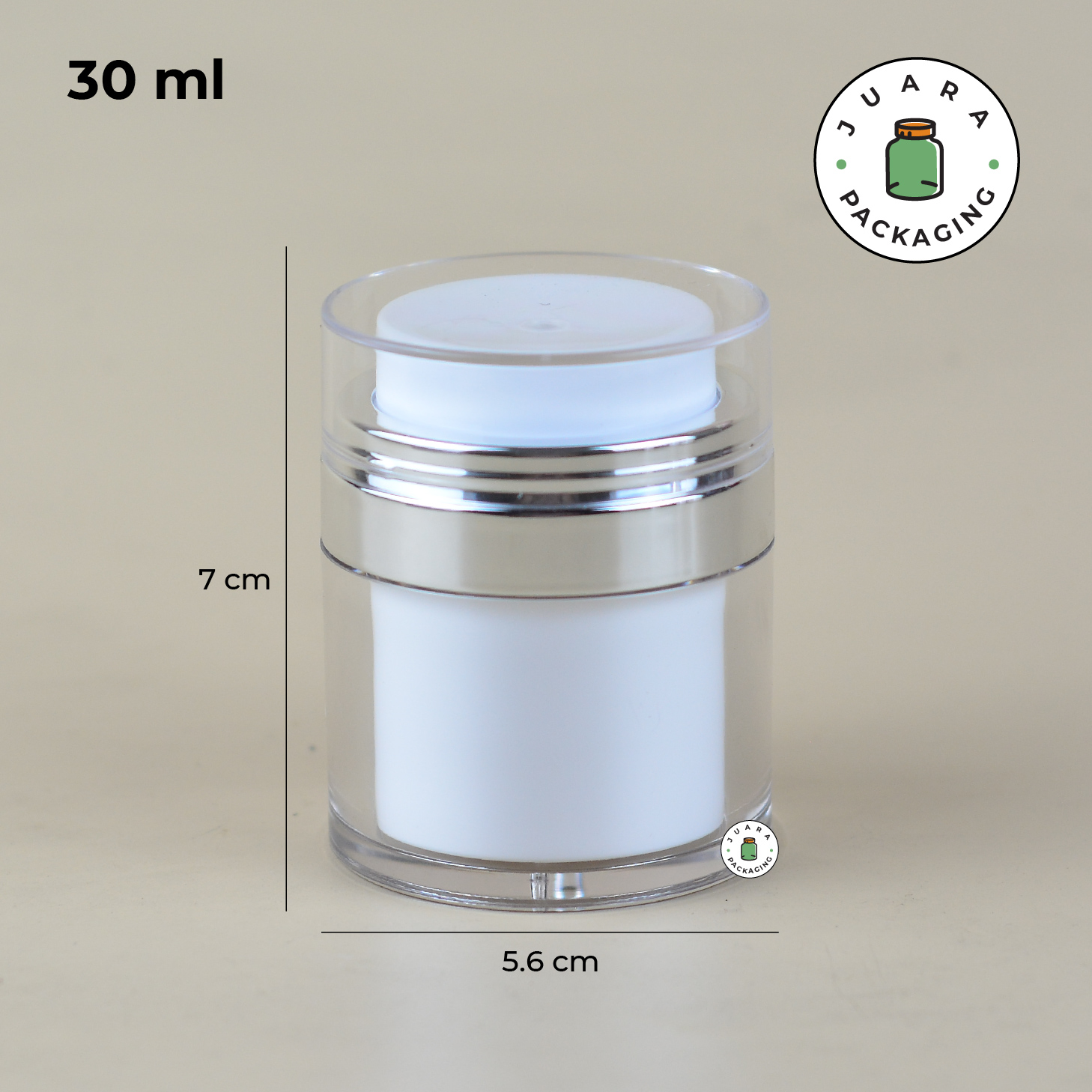 Pot Cream Airless Pump tersedia dalam ukuran 15ml, 30ml, 50ml, dan 100ml, terbuat dari bahan akrilik berkualitas dengan desain putih elegan dan list silver. Kemasan produk ini menjaga kebersihan dan keawetan isi, cocok untuk skincare seperti cream, lotion, atau serum. Praktis, higienis, dan berkelas untuk koleksi kosmetik Anda.