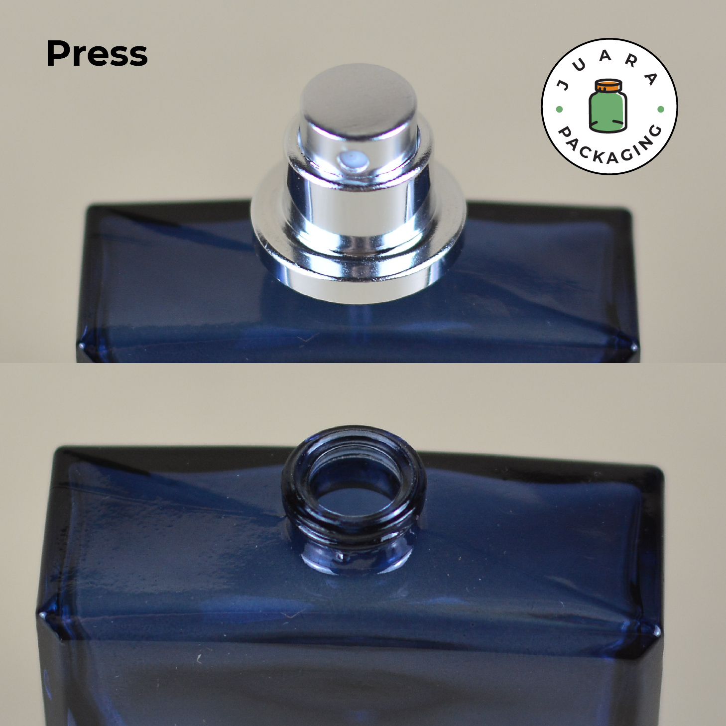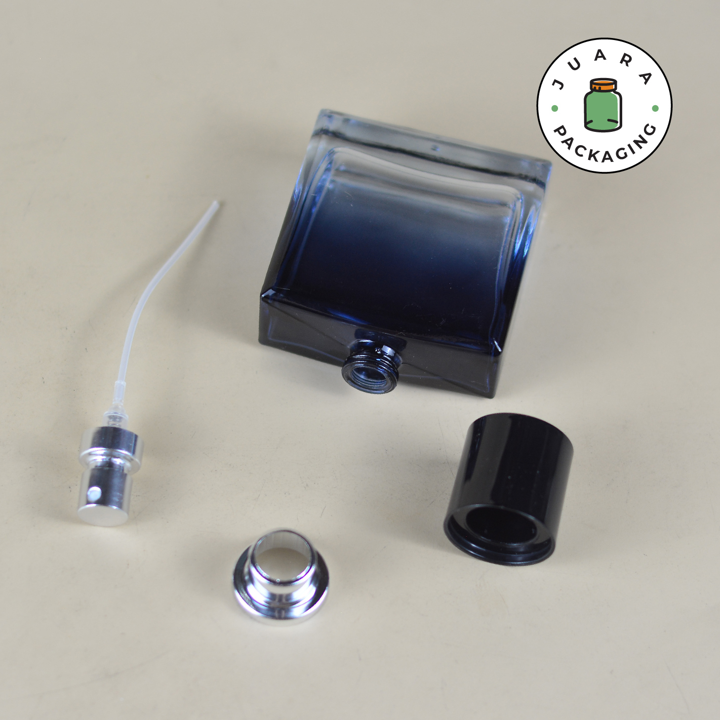Botol Parfum Spray Kaca 50ml kotak tebal dengan warna hitam biru gradasi ini tampil elegan dan eksklusif. Dilengkapi spray press dan tutup hitam, cocok sebagai kemasan produk refill parfum premium 50 ml. Desain mewah dan kuat, ideal untuk penyimpanan perfume dengan kesan profesional dan menawan.