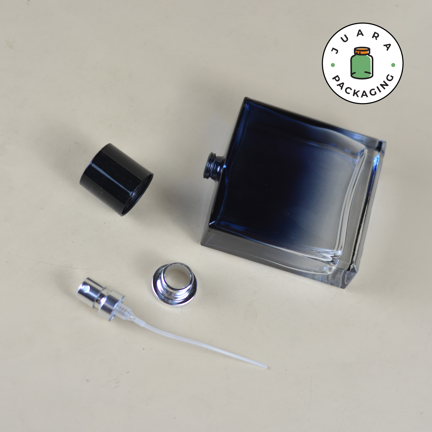 Botol Parfum Spray Kaca 50ml kotak tebal dengan warna hitam biru gradasi ini tampil elegan dan eksklusif. Dilengkapi spray press dan tutup hitam, cocok sebagai kemasan produk refill parfum premium 50 ml. Desain mewah dan kuat, ideal untuk penyimpanan perfume dengan kesan profesional dan menawan.