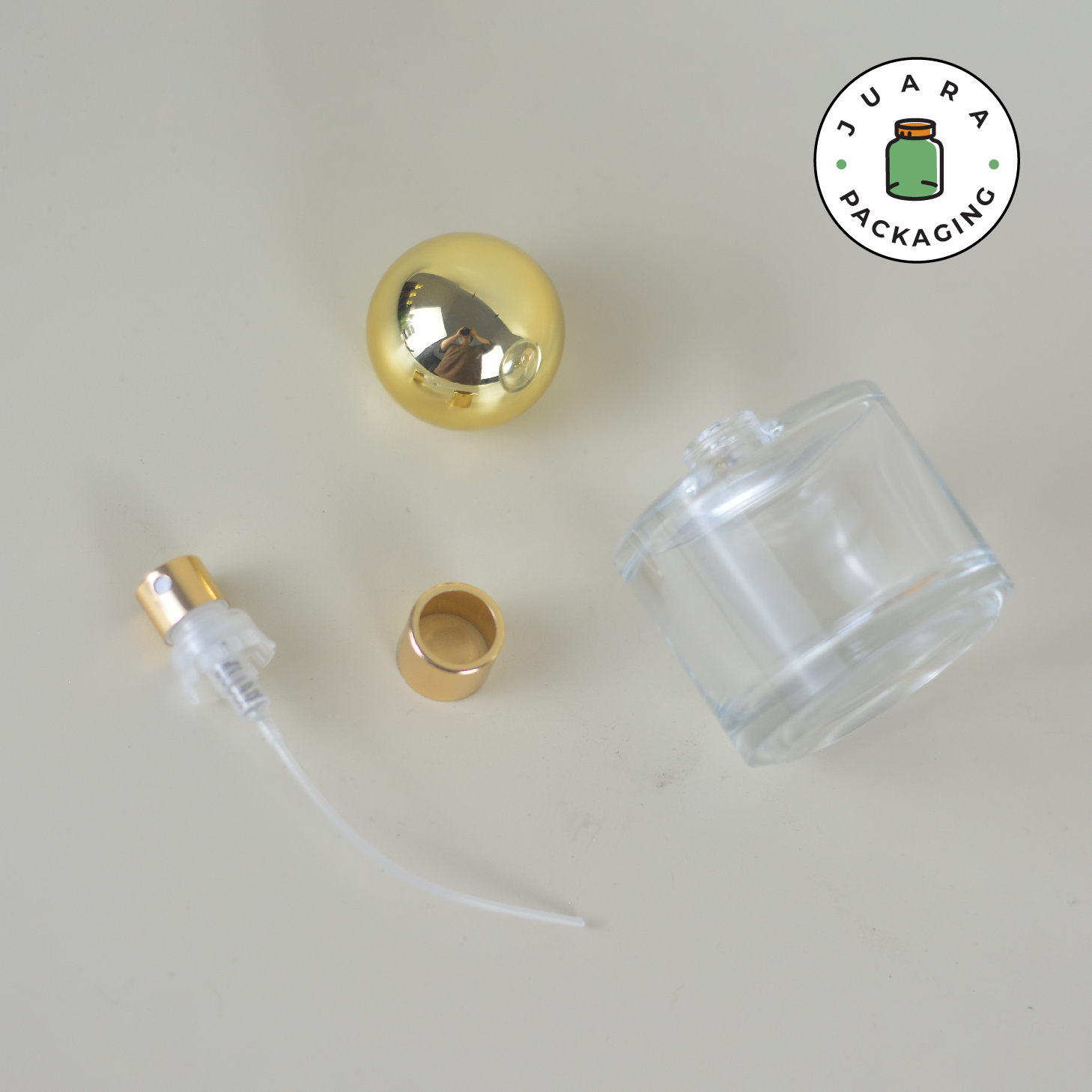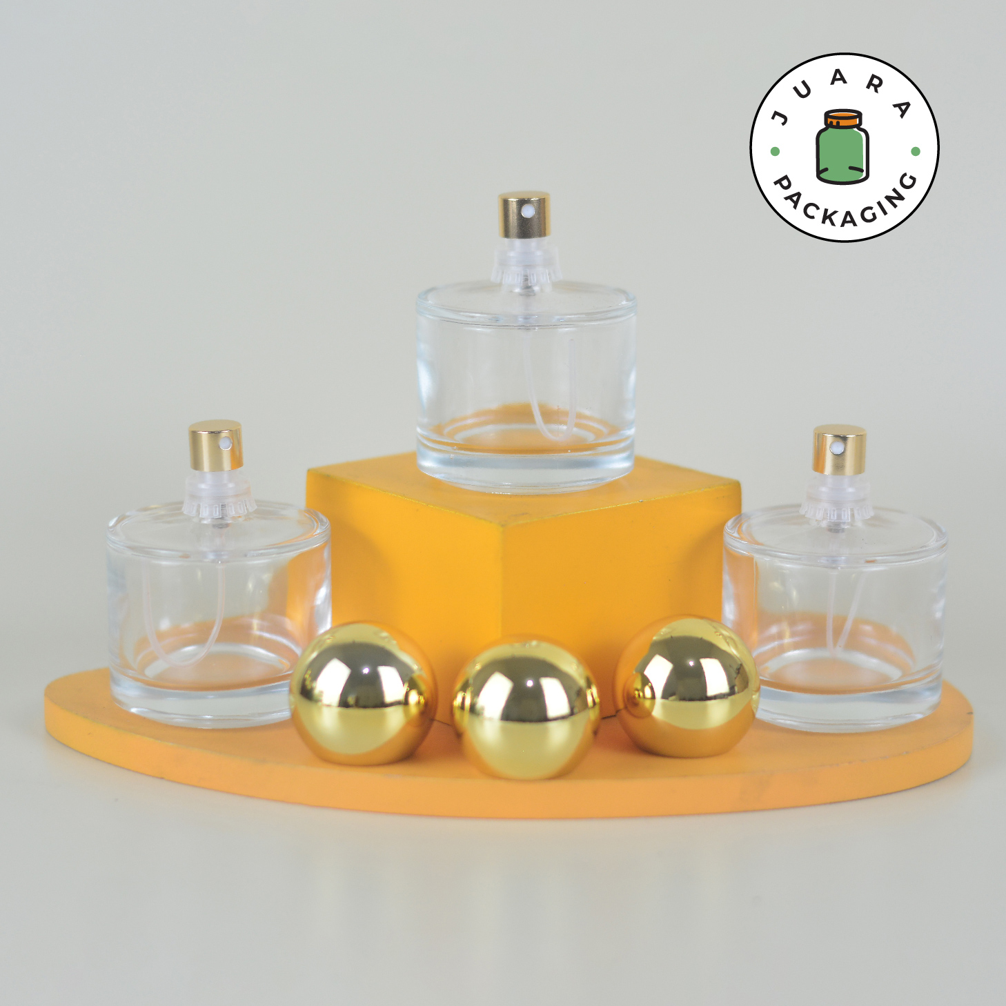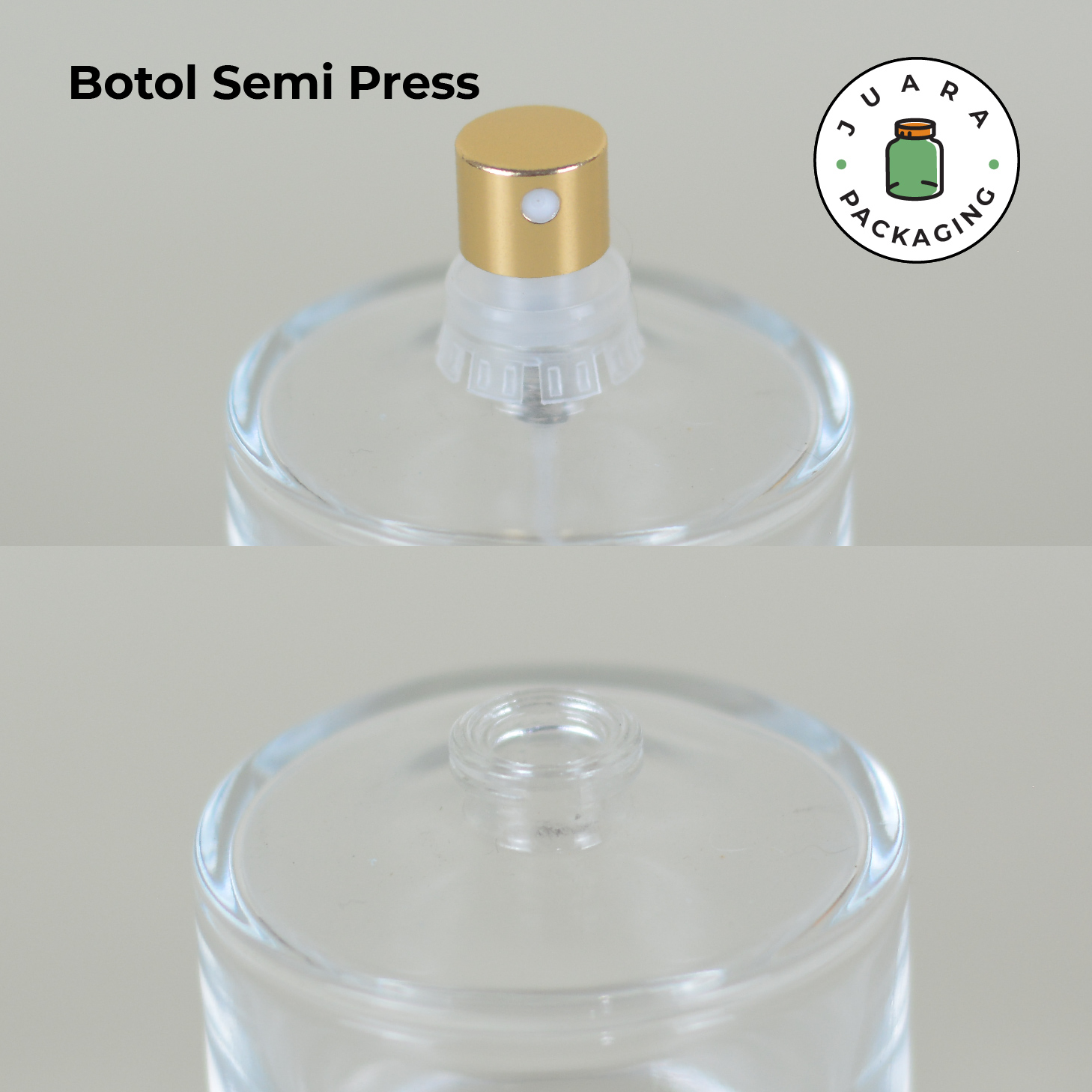 Botol parfum elegan dengan desain semi press yang membuat tampilan lebih premium dan modern. Dengan kaca bening dipadukan dengan tutup bulat dan sprayer gold yang mewah. Cocok untuk kebutuhan refill parfum, brand UMKM, maupun penggunaan pribadi.