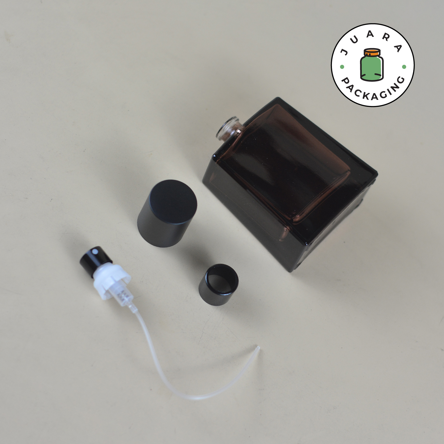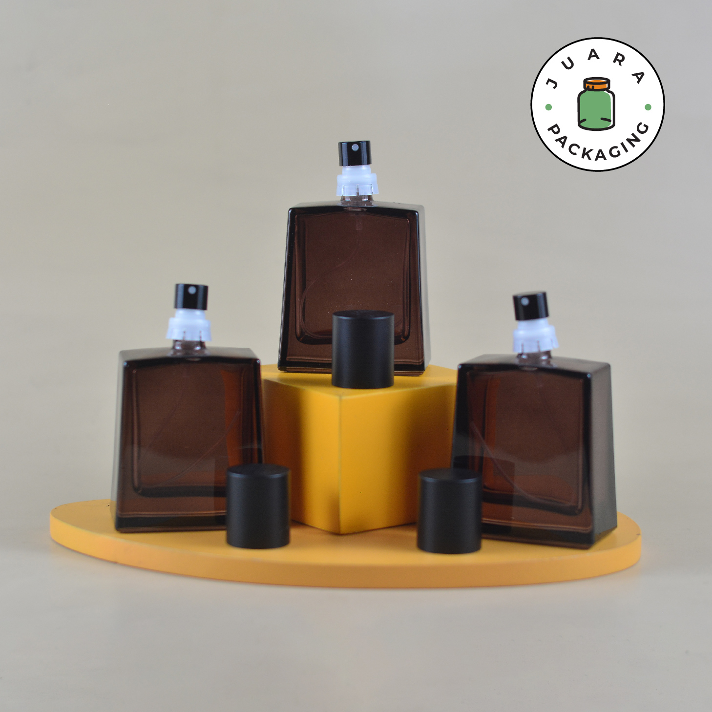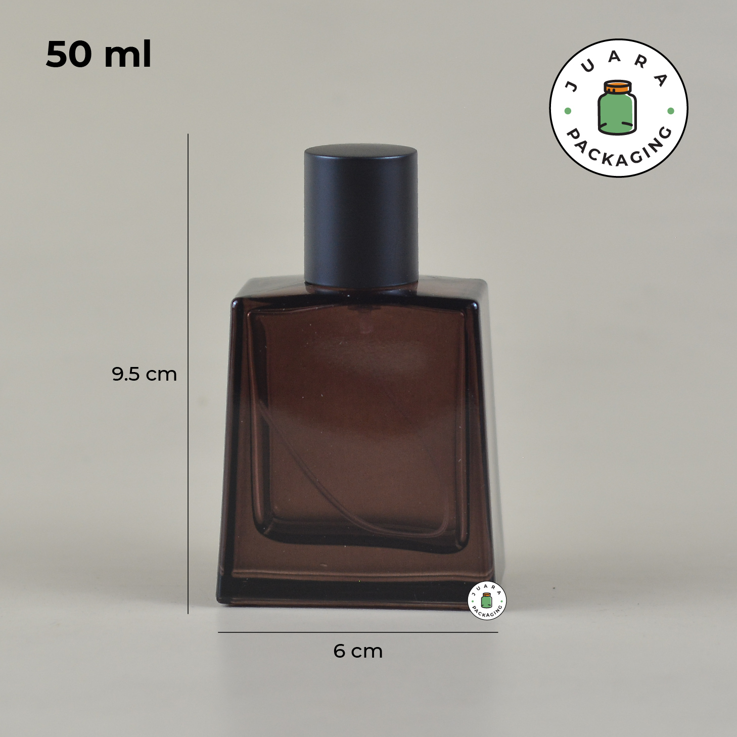 Botol Parfum Spray Kaca 50ml ini memiliki bentuk kotak dengan kaca coklat transparan yang elegan dan fungsional. Dilengkapi spray semi press dan tutup hitam, kemasan produk ini cocok untuk parfum premium, memberikan perlindungan terhadap cahaya sekaligus menjaga aroma tetap tahan lama dan berkualitas.