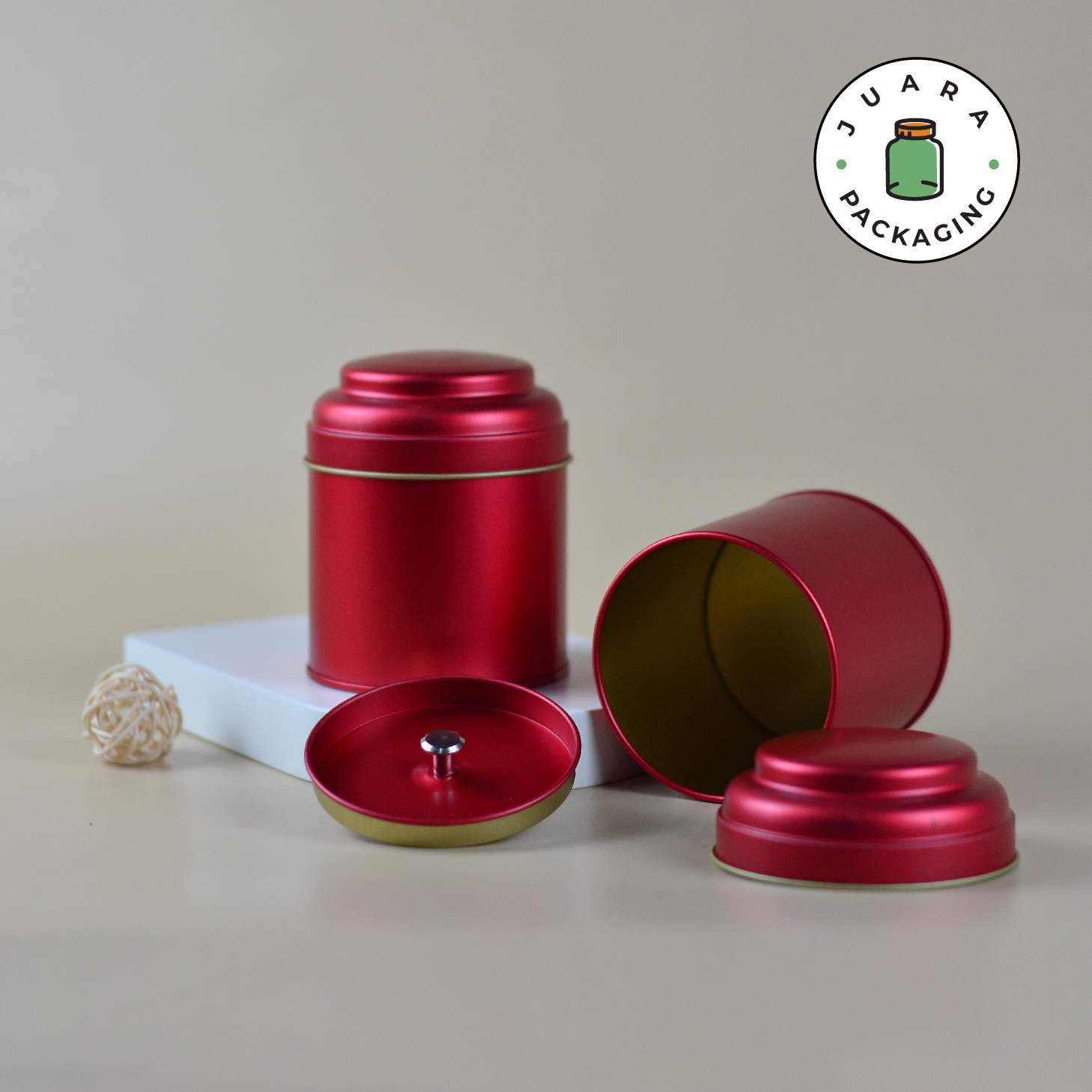 Wadah tin merah berbentuk jar atau toples ini merupakan pilihan sempurna untuk kemasan produk yang ingin tampil elegan. Desainnya yang menarik dan aman dari karat menjaga kesegaran produk di dalamnya. Cocok digunakan untuk berbagai produk seperti makanan, kosmetik, atau barang pecah belah lainnya.