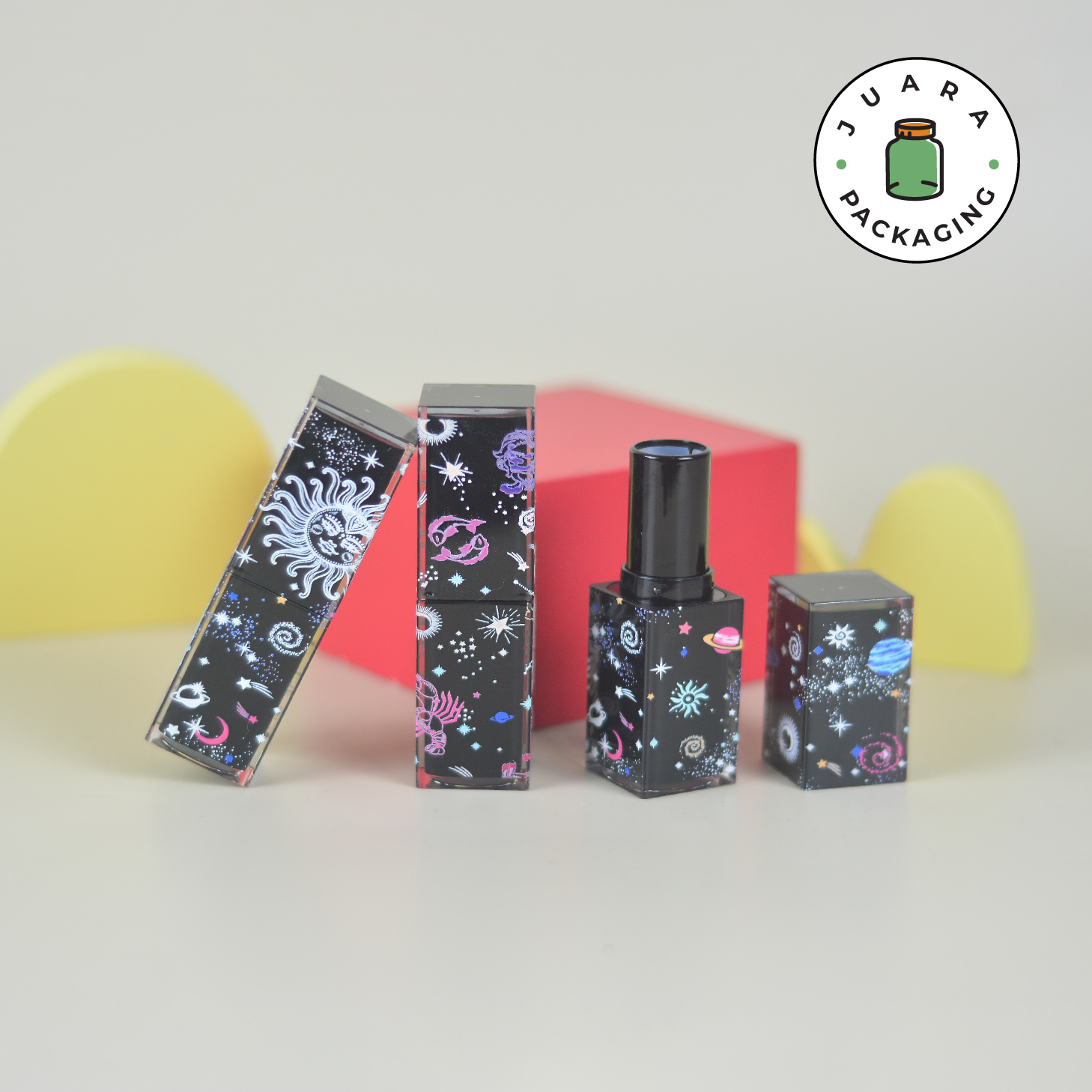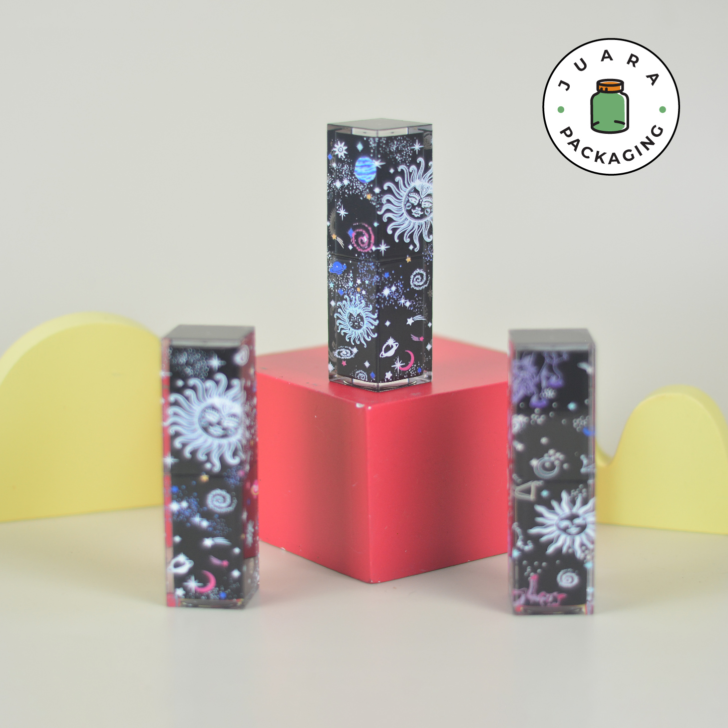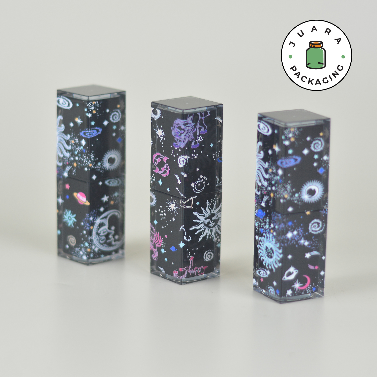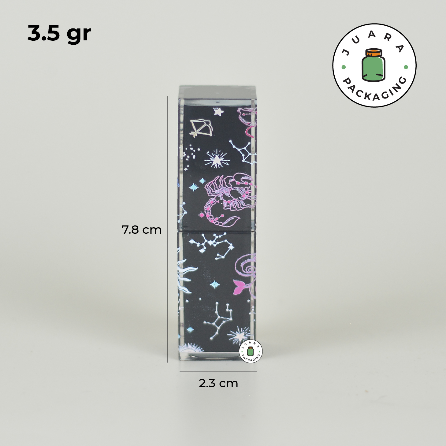Kemasan lipstick dan lipbalm akrilik premium 3.5 gr dengan desain motif rasi bintang (zodiac) yang elegan dan modern. Cocok untuk kamu yang ingin membuat produk kosmetik handmade atau brand sendiri dengan tampilan eksklusif.